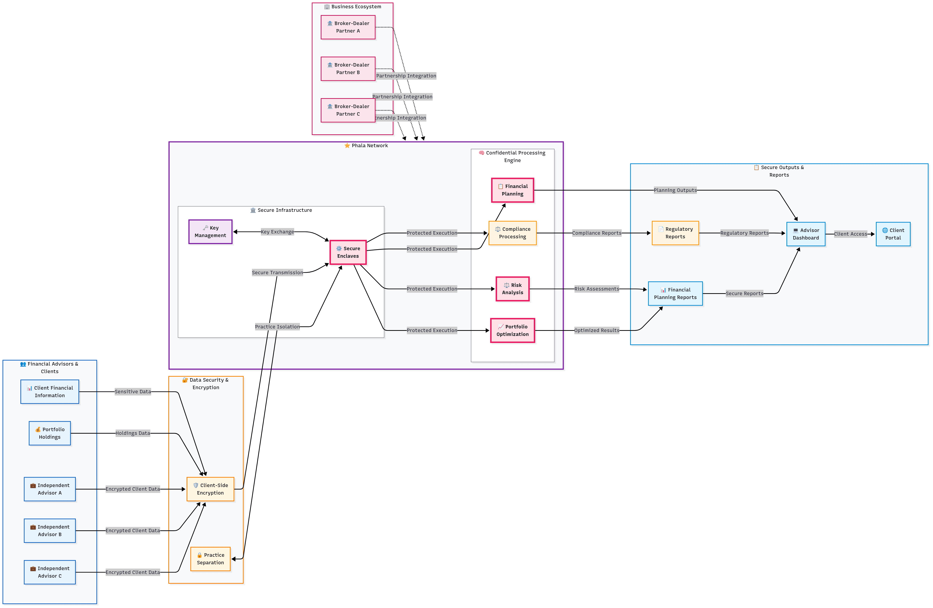 Confidential Portfolio Processing: Client financial data encrypted at the advisor level and processed within secure enclaves for portfolio optimization, risk analysis, and compliance reporting. Advanced financial planning algorithms operate within protected environments to safeguard proprietary intellectual property.