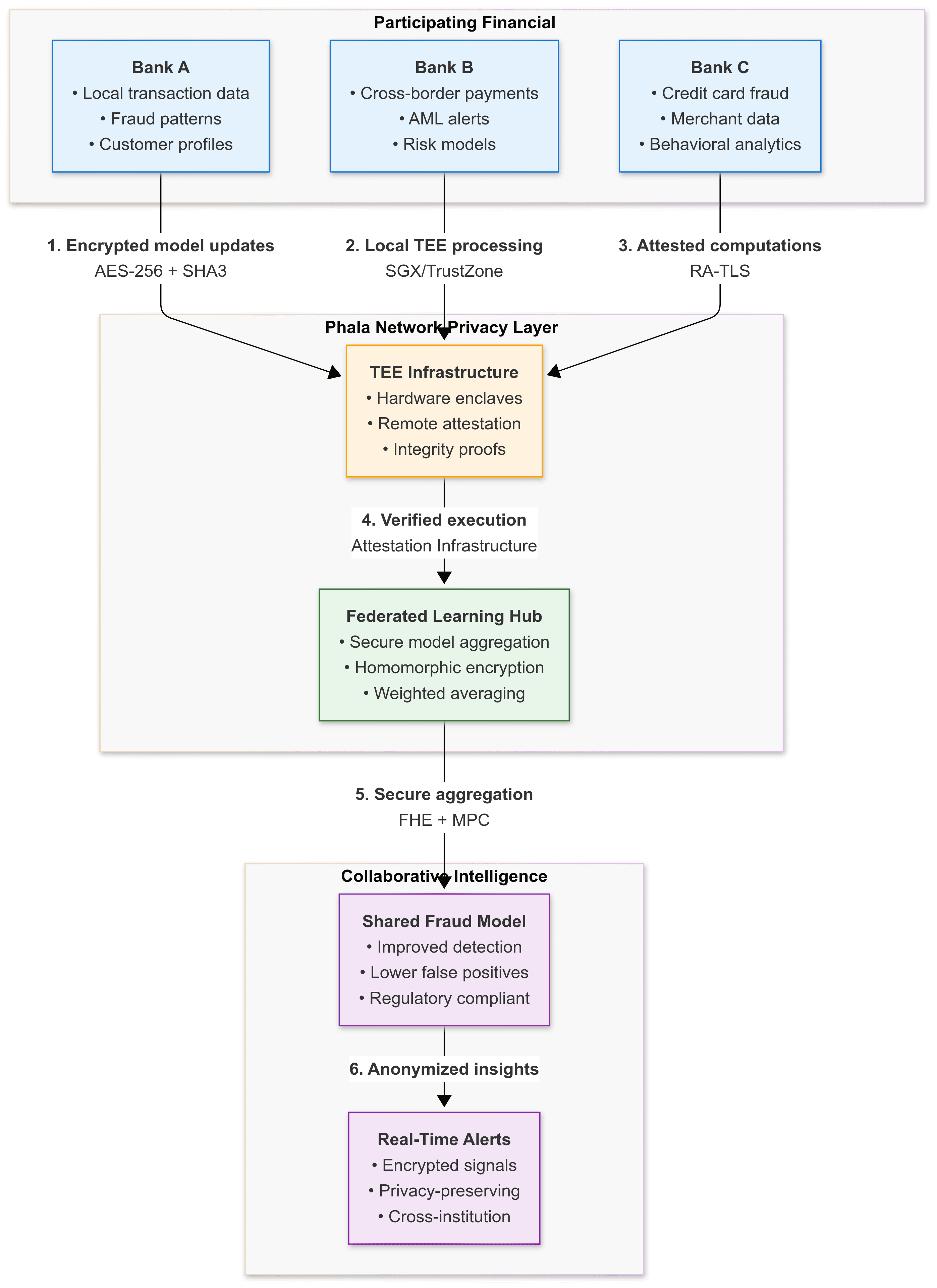 Privacy-Preserving Model Training: Federated learning protocols enable model enhancement across different customer segments and geographic regions without centralizing sensitive financial data. Each data source contributes to model improvement while maintaining cryptographic control over information.