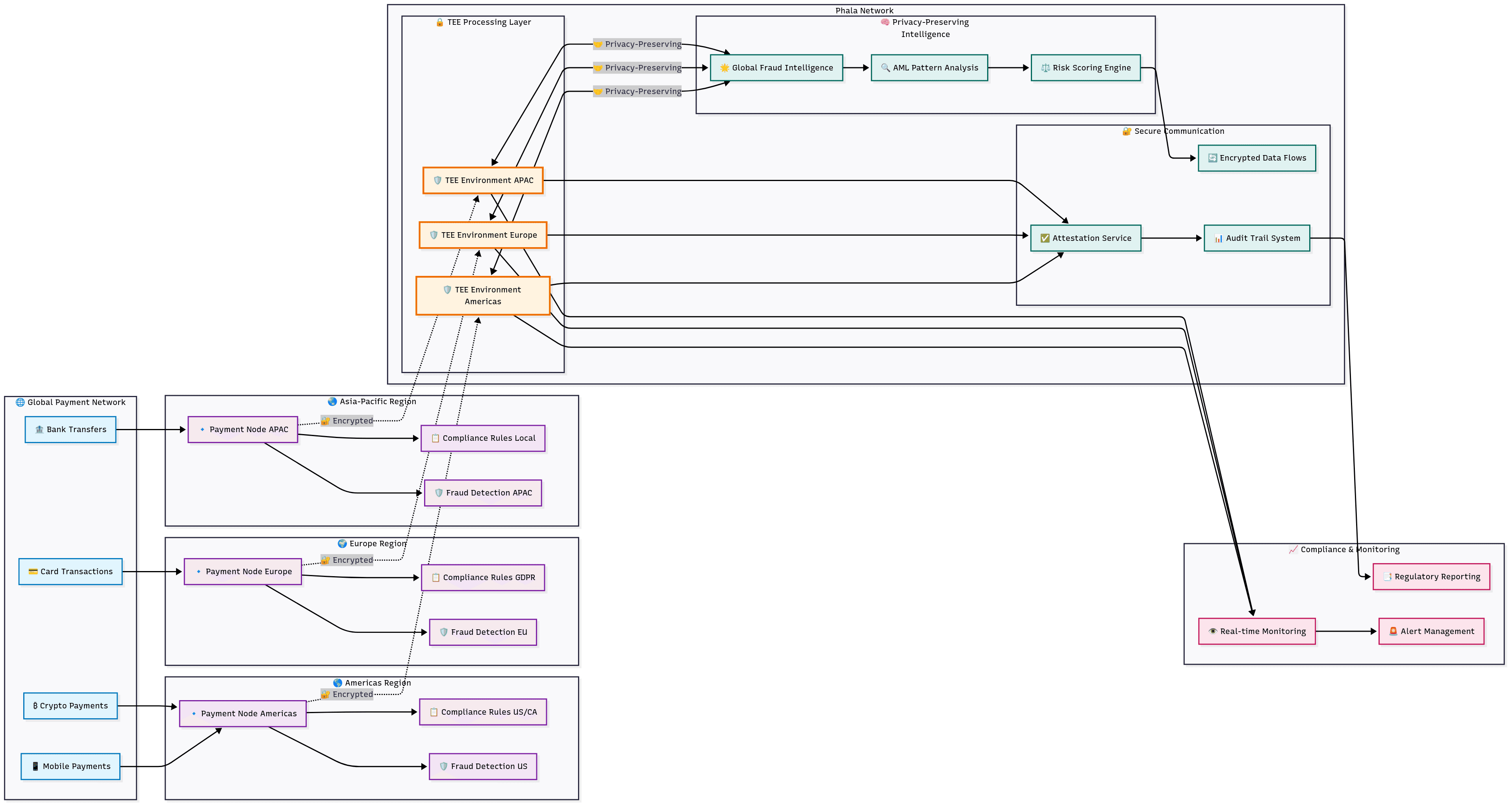 TEE-Based Transaction Processing: All payment processing occurs within trusted execution environments providing mathematical isolation from infrastructure administrators and external entities. Transaction data remains encrypted throughout processing, addressing fundamental vulnerabilities in traditional payment systems.