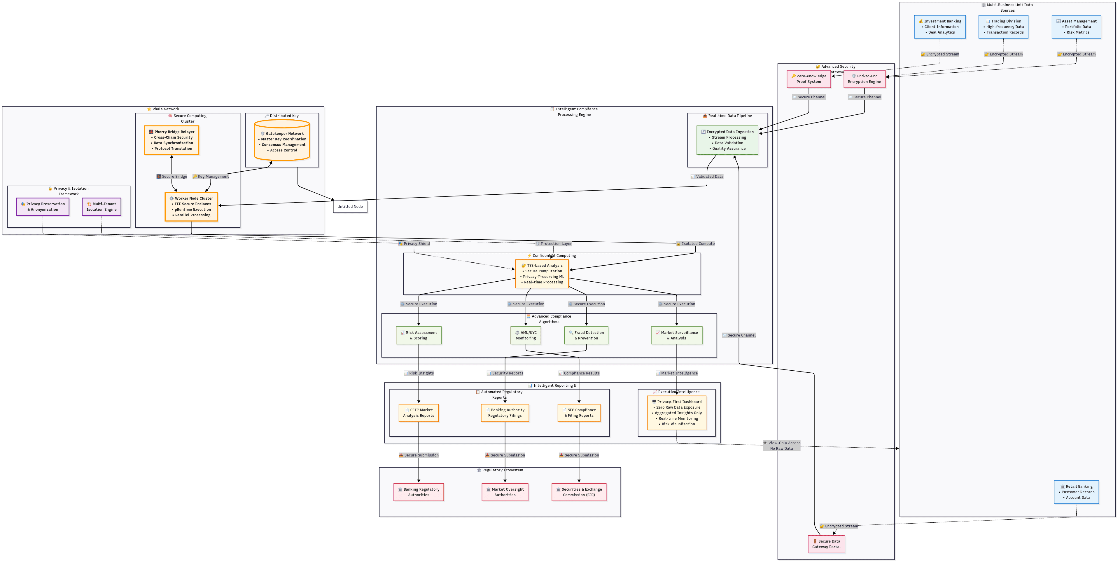 TEE-Based Compliance Monitoring: Sophisticated compliance algorithms process sensitive operational data from multiple business units within hardware-protected environments. Compliance rules and monitoring logic remain confidential while analyzing comprehensive operational information.
