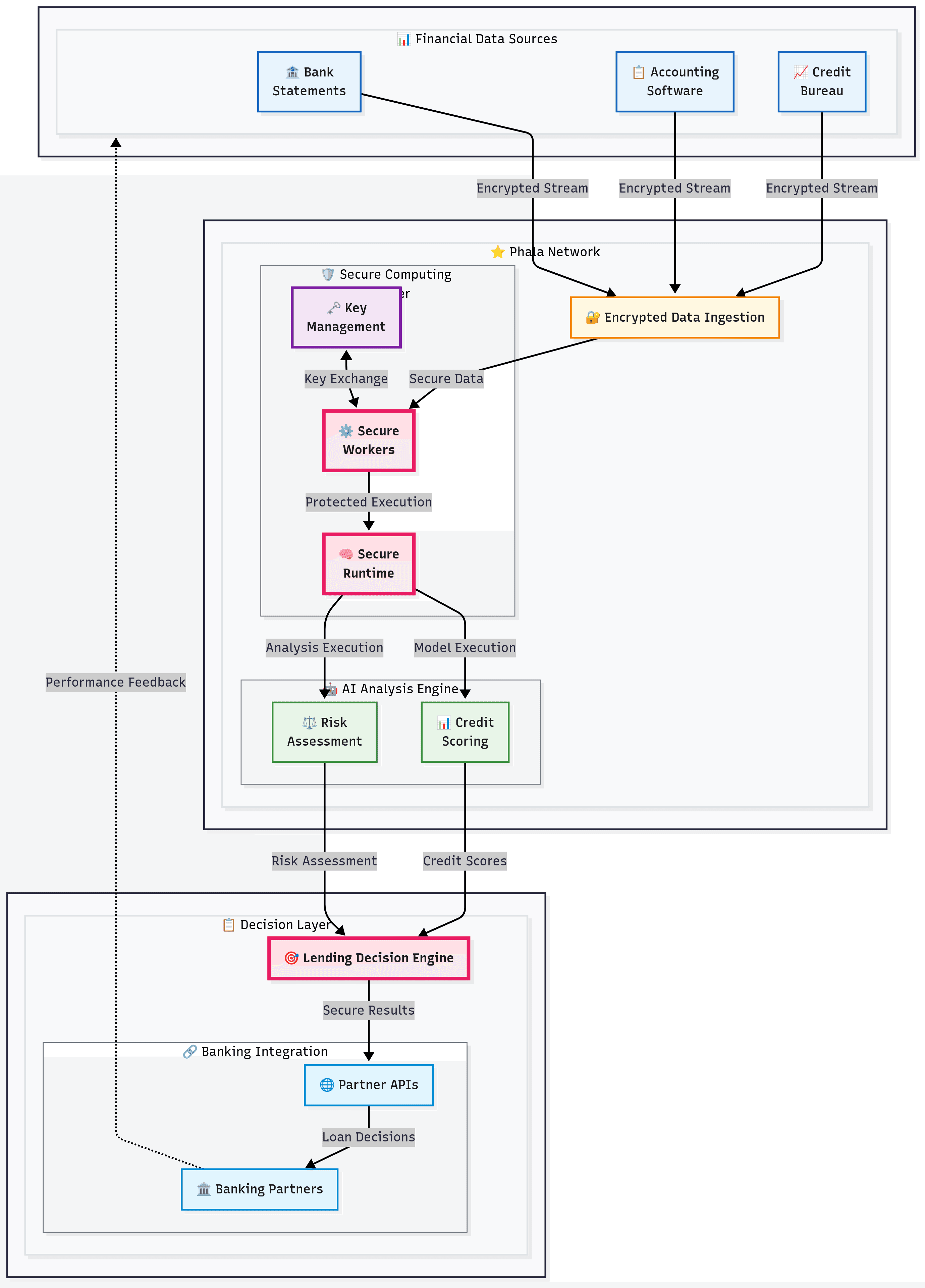 Multi-Source Data Integration in TEEs: Automated data ingestion pipelines encrypt SME financial data before processing within the secure environment. Bank statements, accounting records, and credit bureau data are processed collectively while maintaining strict data isolation and preventing unauthorized access.