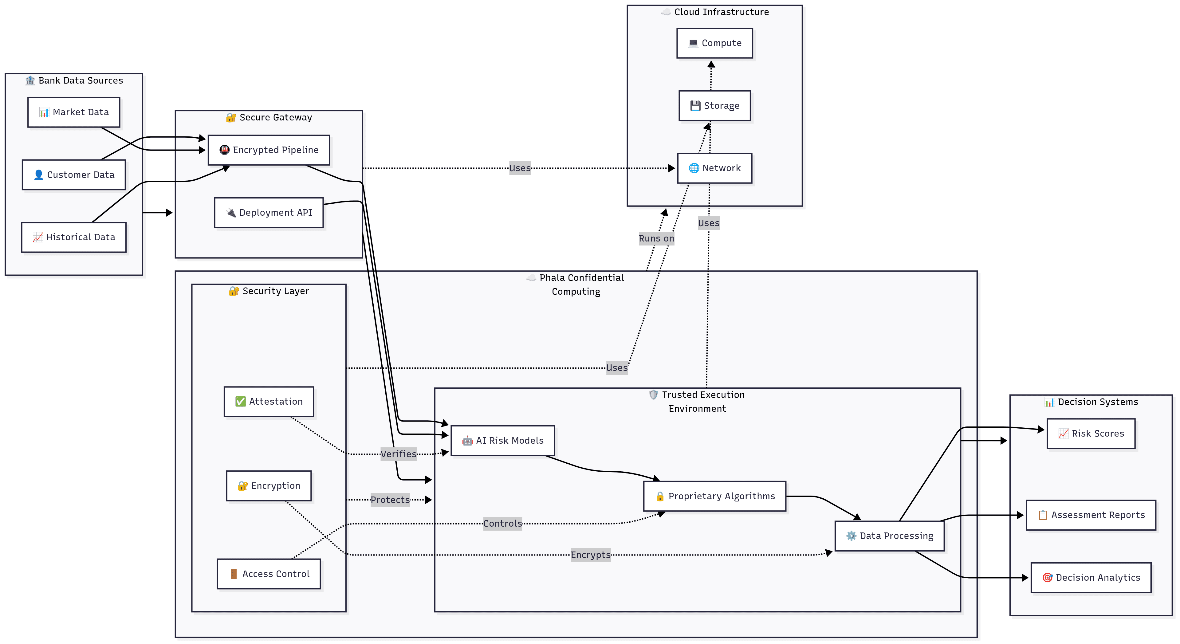 Confidential Credit Scoring Environment: Proprietary credit scoring algorithms deployed within secure computing enclaves that process sensitive SME financial data without exposing information to cloud providers or internal personnel. Hardware-level data protection ensures complete confidentiality of both algorithms and customer data during processing.