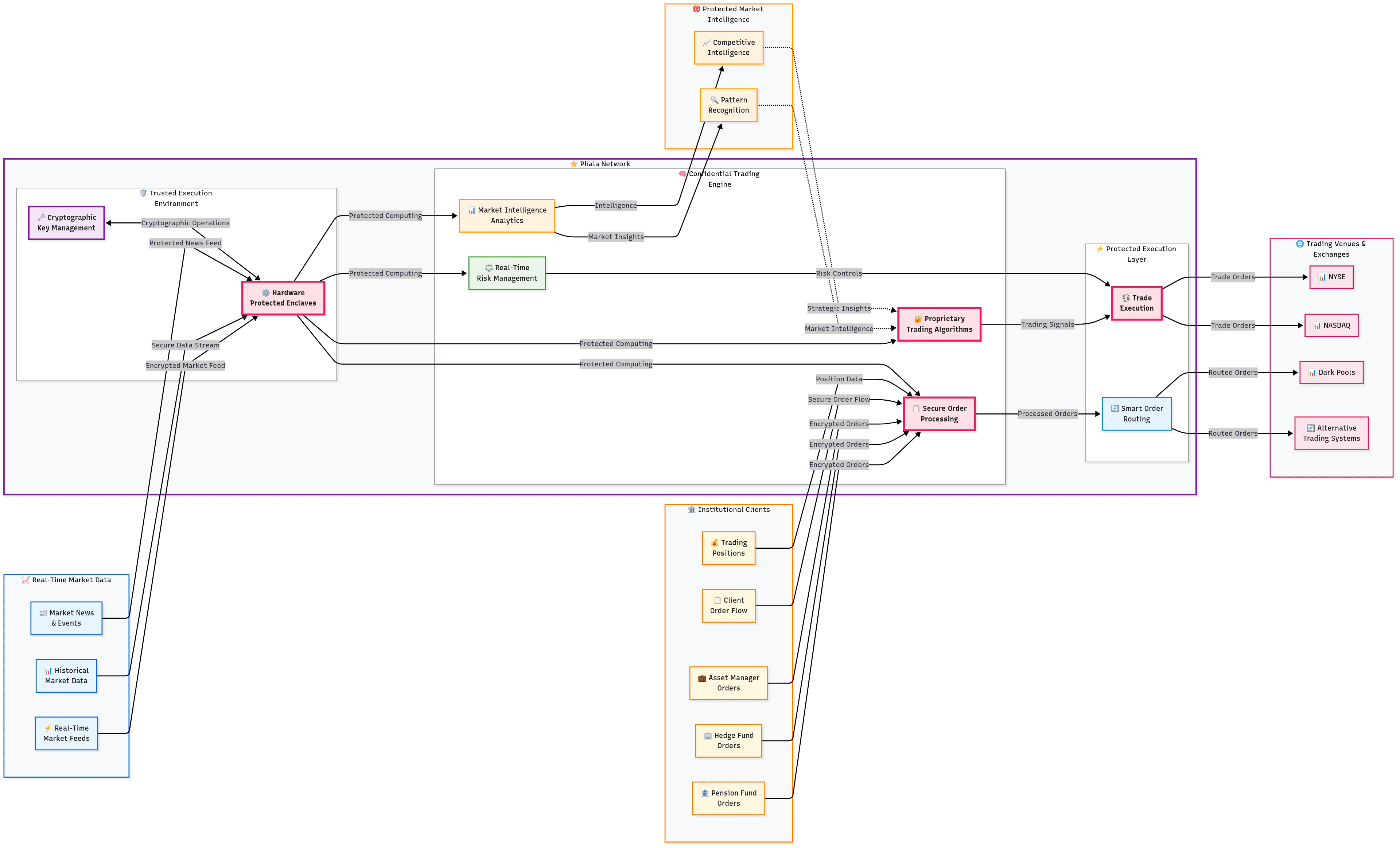 Privacy-Preserving Market Intelligence: Advanced market analysis and pattern recognition algorithms analyze market data and trading flows within secure environments, generating competitive intelligence while protecting analytical methods and client information.