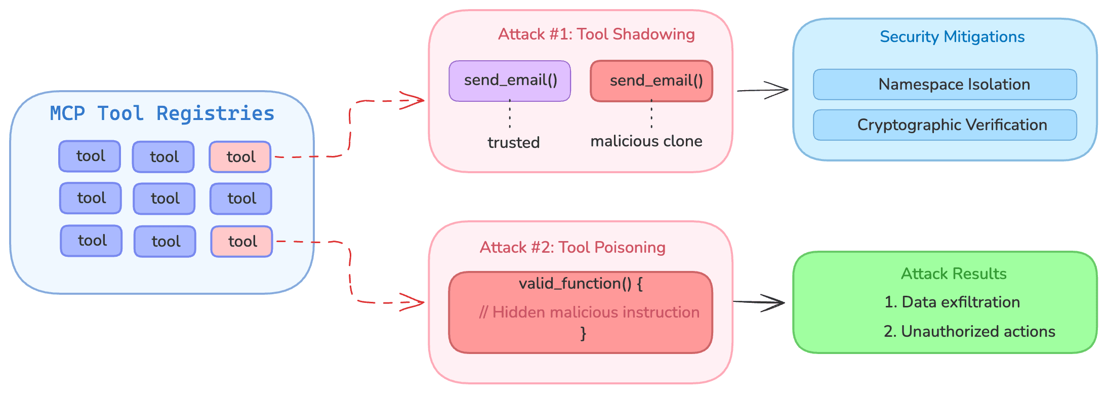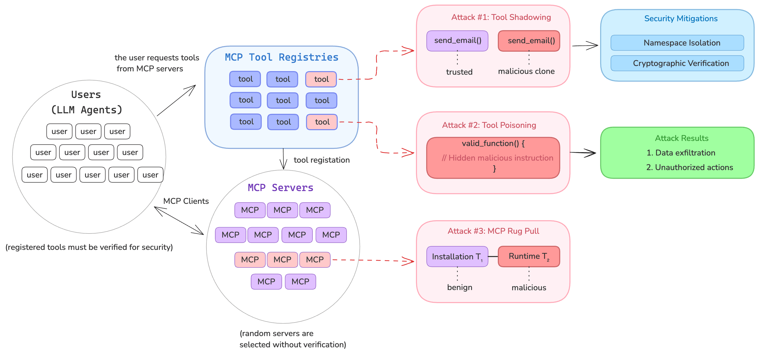 - No integrity verification of tool definitions (an agent cannot tell if a tool’s code/description has been altered or if it truly comes from a trusted source).