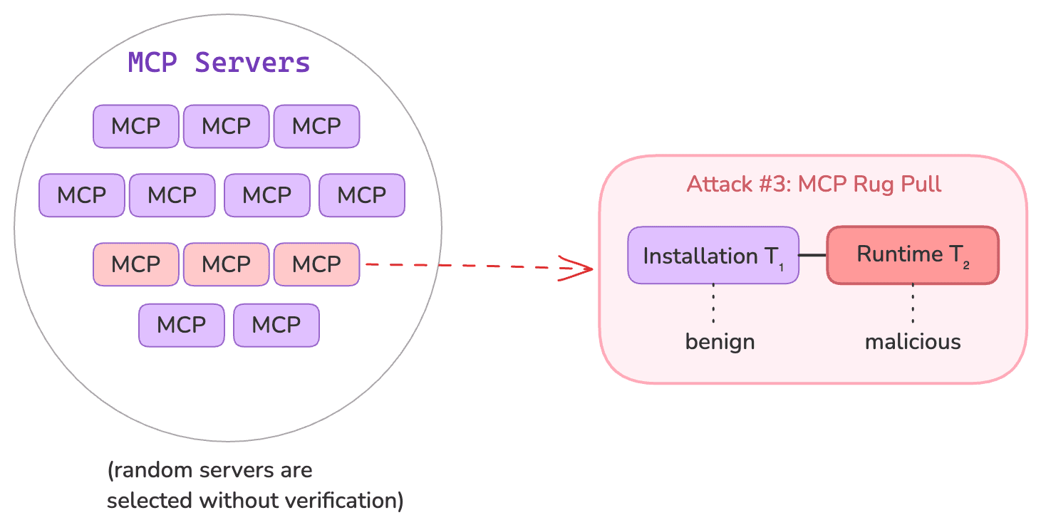 “Rug Pull” Tool Redefinition: MCP tools can dynamically change after installation, enabling a rug pull scenario. As Elena Cross puts it, “You approve a safe-looking tool on Day 1, and by Day 7 it’s quietly rerouted your API keys to an attacker.” In other words, a tool that was originally benign can silently mutate its code or description to become malicious in a future update without the user noticing.
