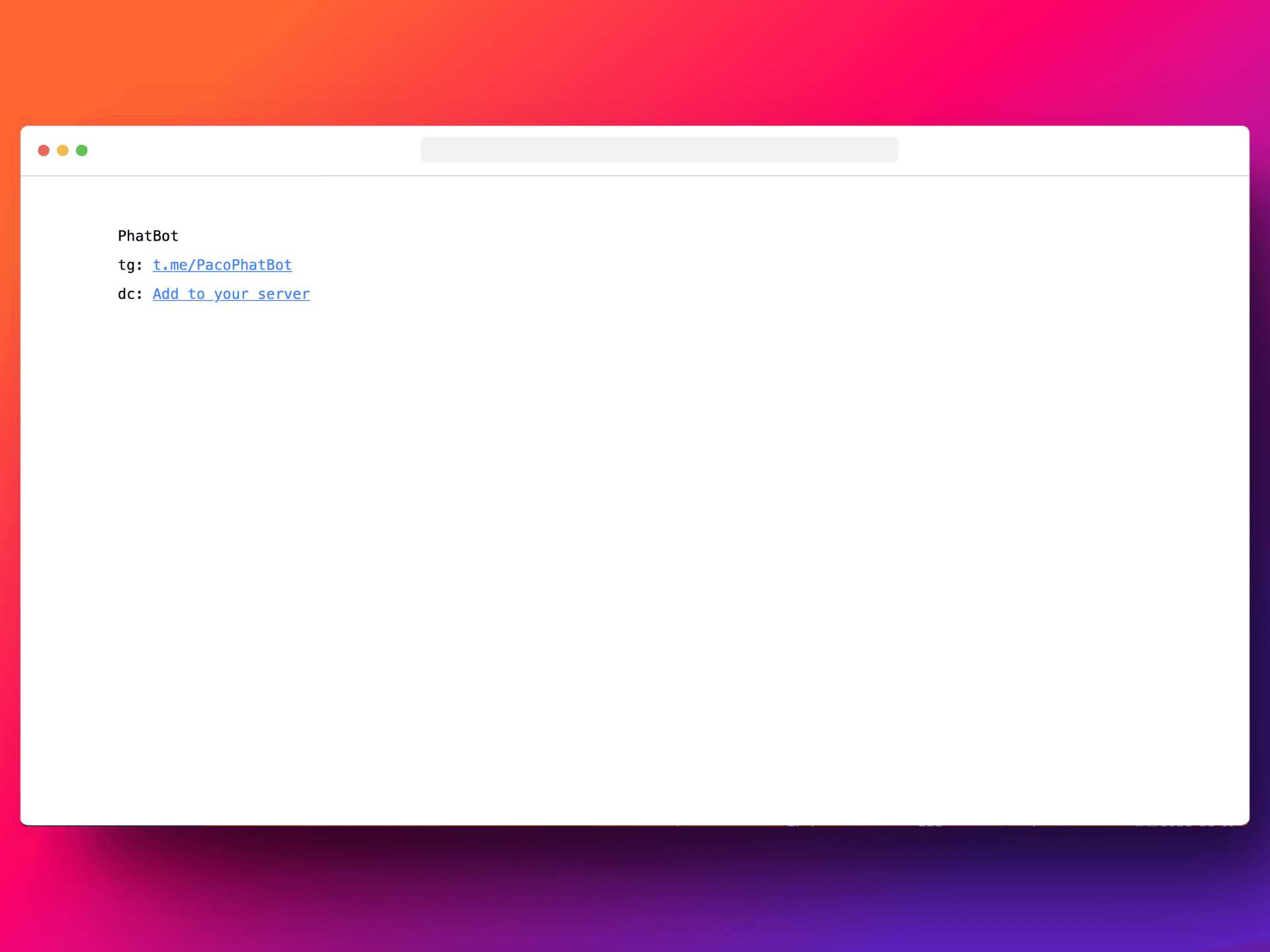 Visit Phatbot Demo to interact with either the Telegram or Discord bot.