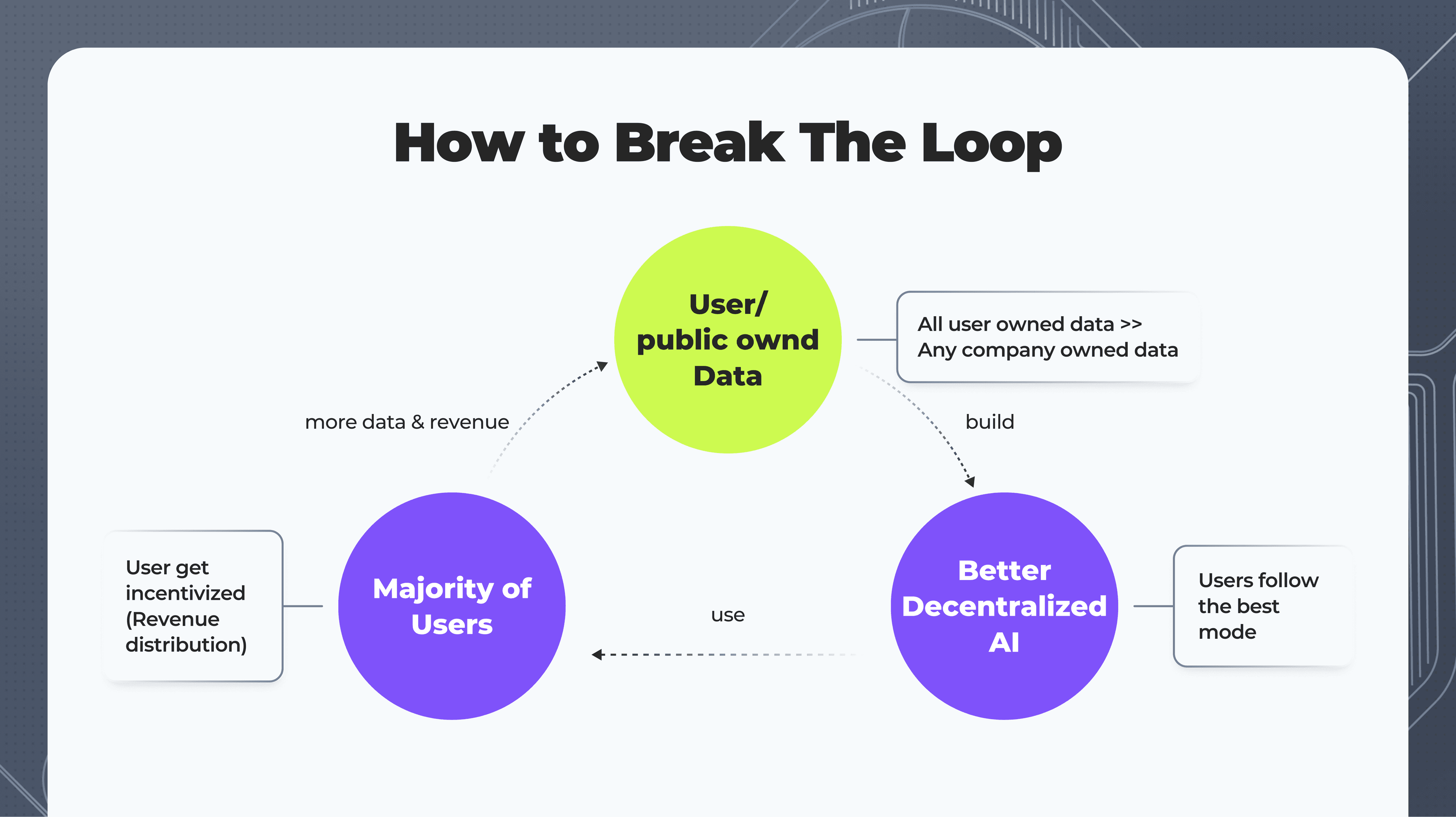 - Example: Imagine a decentralized AI platform where various stakeholders—such as data providers, individual contributors, and organizations—collaborate to develop and improve AI models. These models might be used for diverse purposes, such as language processing, autonomous decision-making, or even managing decentralized autonomous organizations (DAOs). To function effectively, this ecosystem needs to address several key challenges, which require a well-designed infrastructure.