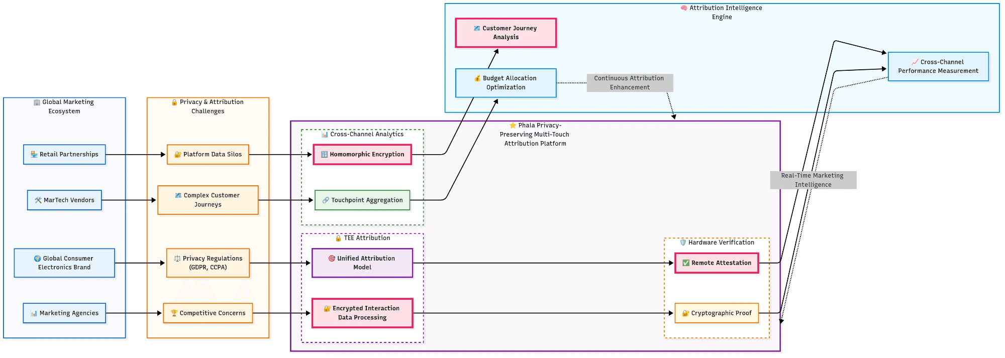 TEE-Based Attribution Modeling: Implementation of multi-touch attribution algorithms within trusted execution environments (TEEs), enabling each marketing channel to contribute encrypted interaction data to a unified attribution model. Raw customer data never leaves each organization's security perimeter while enabling comprehensive journey analysis.