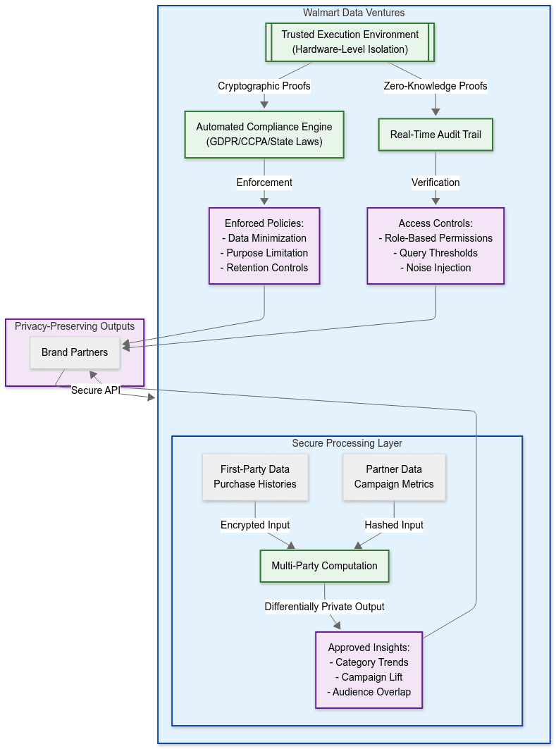 Consumer Data Protection: Walmart's trusted execution environments enable brand partners to access consumer insights without exposing individual customer purchase histories. TEE-based analytics process transaction data and shopping behavior while maintaining cryptographic isolation that prevents unauthorized access to sensitive consumer information.