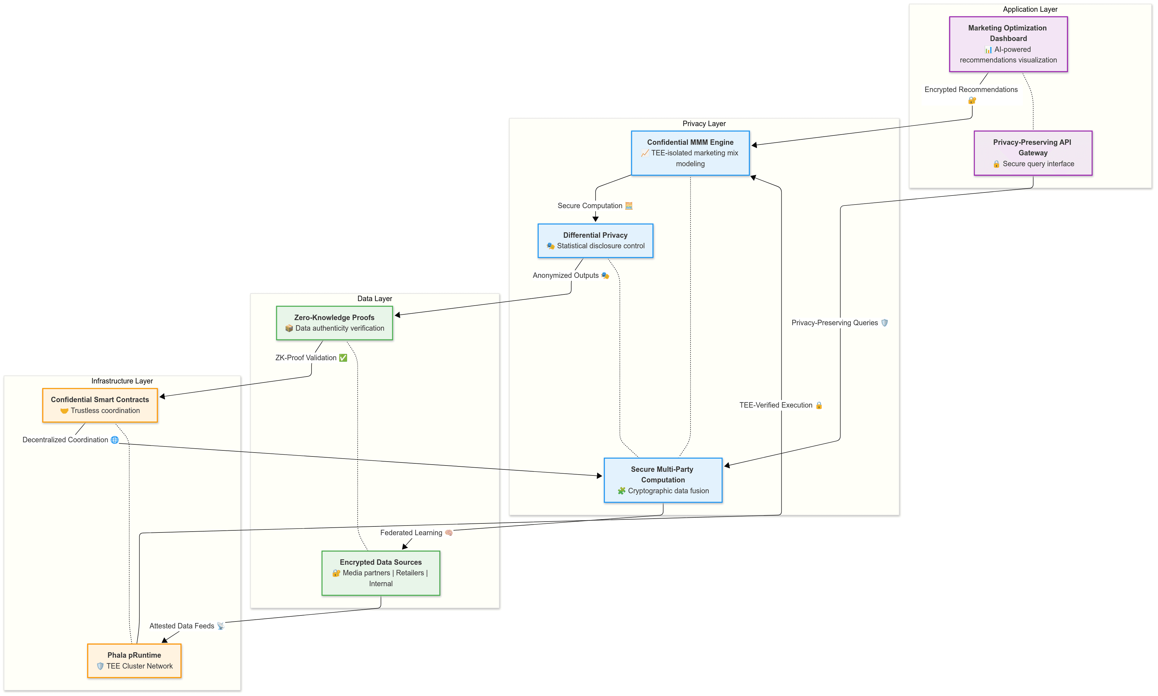 Mid-Market Accessibility: Modular deployment options enable smaller brands to access sophisticated marketing mix modeling without enterprise-scale data infrastructure. Shared TEE resources reduce costs while maintaining individual data isolation, making advanced analytics accessible to organizations with limited budgets