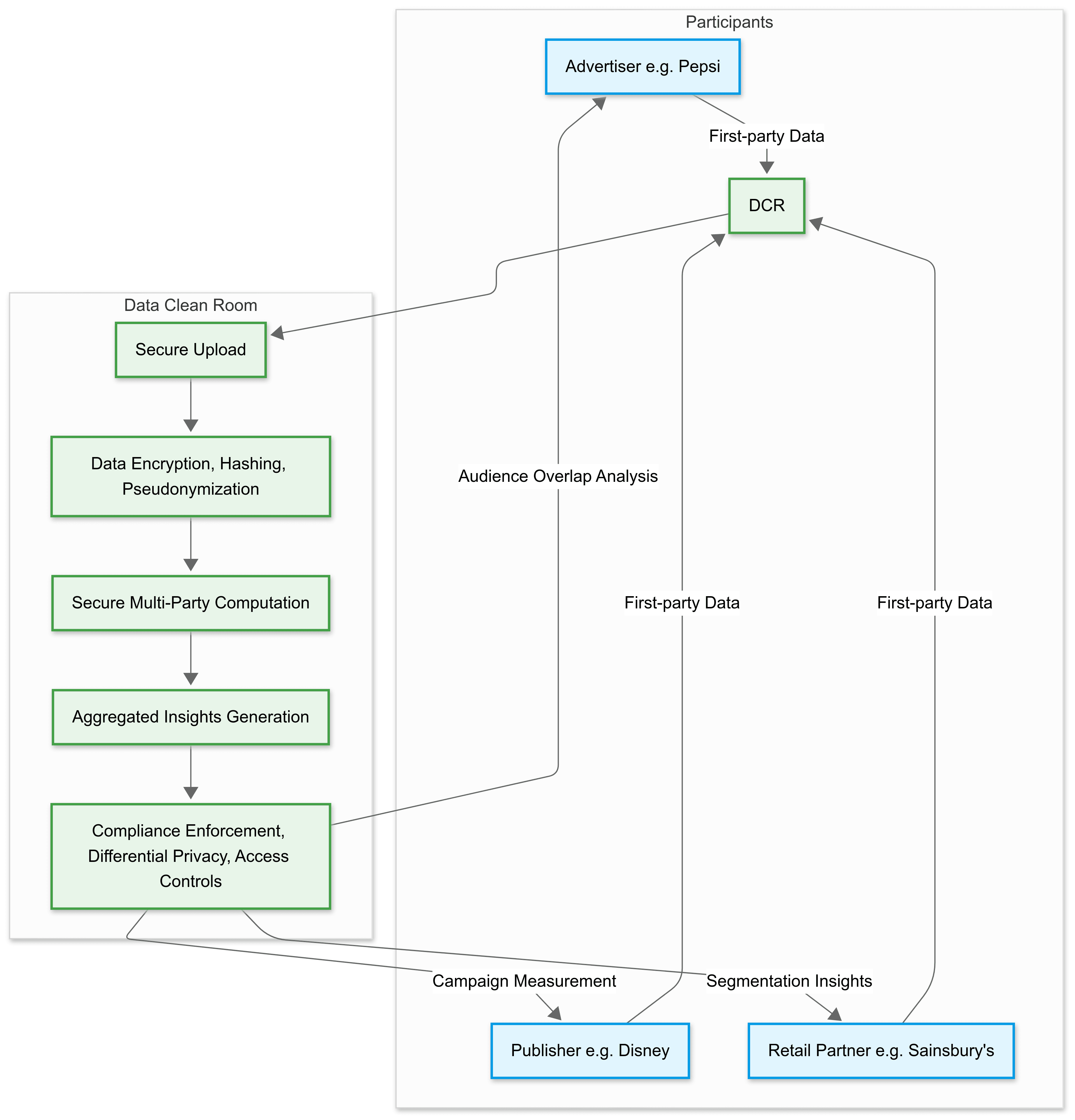 - Secure Multi-Party Environments: Data collaboration occurs within controlled environments where raw data is not exposed, utilizing encryption and hashing techniques.