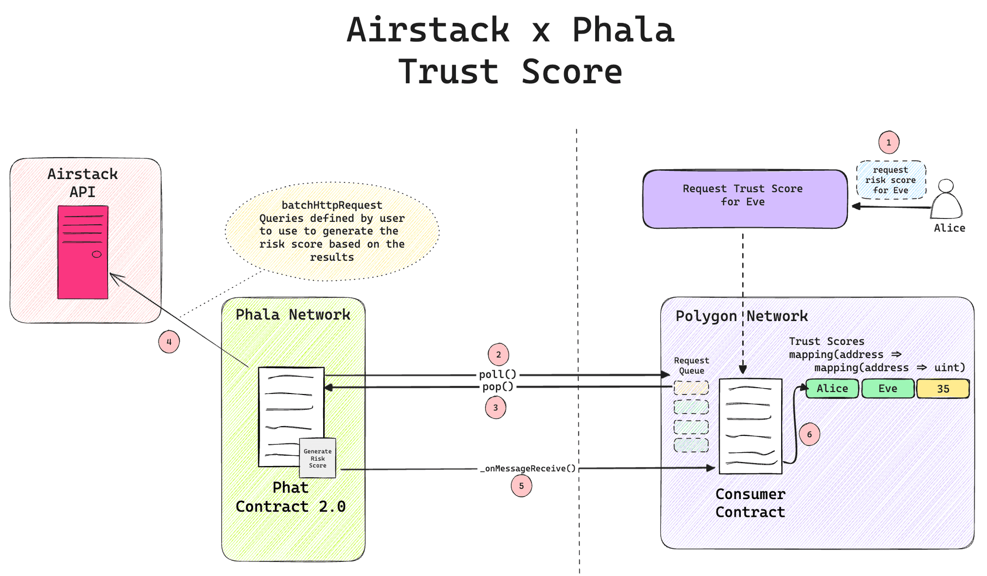 The user journey can be visualized in the diagram above. Alice requests a “trust score” about Eve to the consumer contract on the EVM chain and the action request is added to the request queue. The Phat Contract poll() the queue and pop() the new action request off the queue to compute the trust score for Eve. Once the data is retrieved from Airstack’s API, the score is computed based on the scoring criteria and the result is sent back to the consumer contract on the EVM chain.