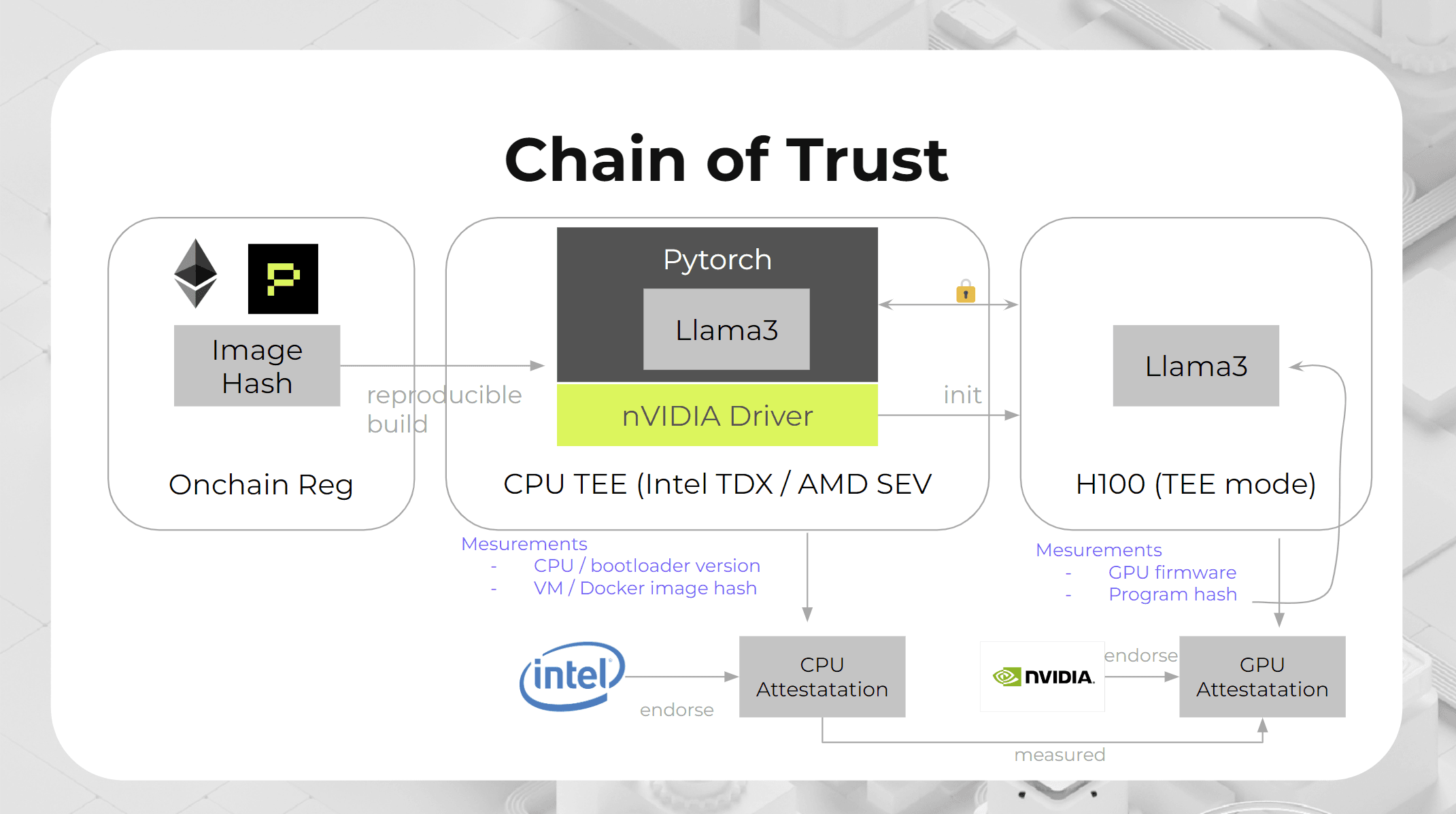 The chain of trust in Phala Network's hybrid GPU + CPU TEE approach ensures a secure and verifiable computational environment. By combining the strengths of both CPU and GPU TEEs, Phala Network provides a robust platform for confidential computing, particularly suited for AI and other compute-intensive applications in the blockchain space. This integrated approach addresses the limitations of CPU-only TEEs, offering a more scalable and and secure solution for the data privacy AGI era.