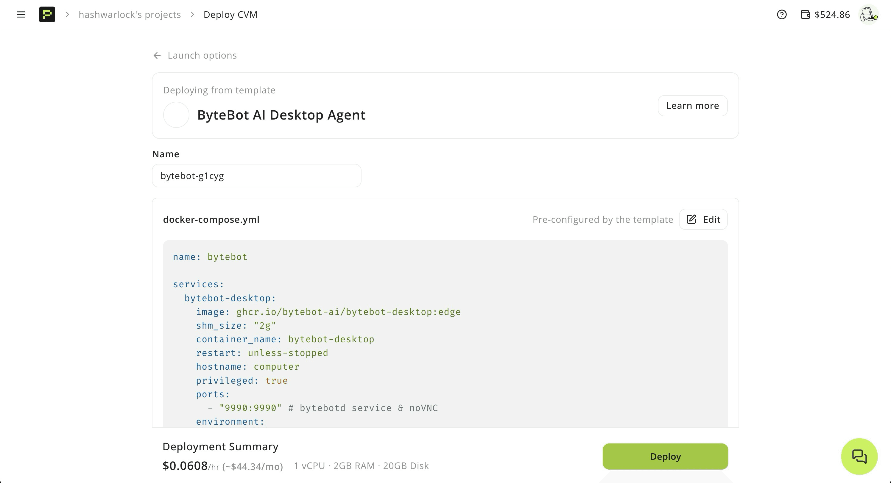 Go to Phala Cloud → Templates → ByteBot → Deploy.