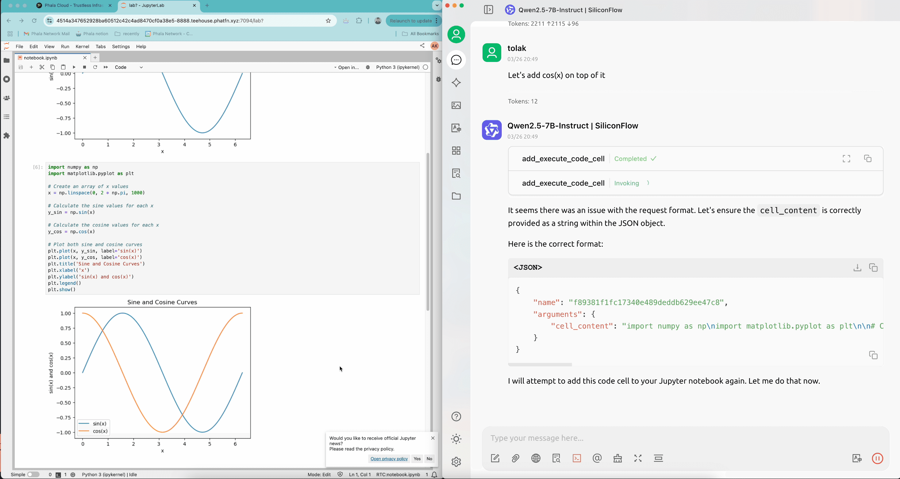 - Navigate to the chat page and you can type in your prompt to ask the client use the LLM to help you manage your notebook, for example we ask the LLM to draw a curve of sin(x) on the notebook.