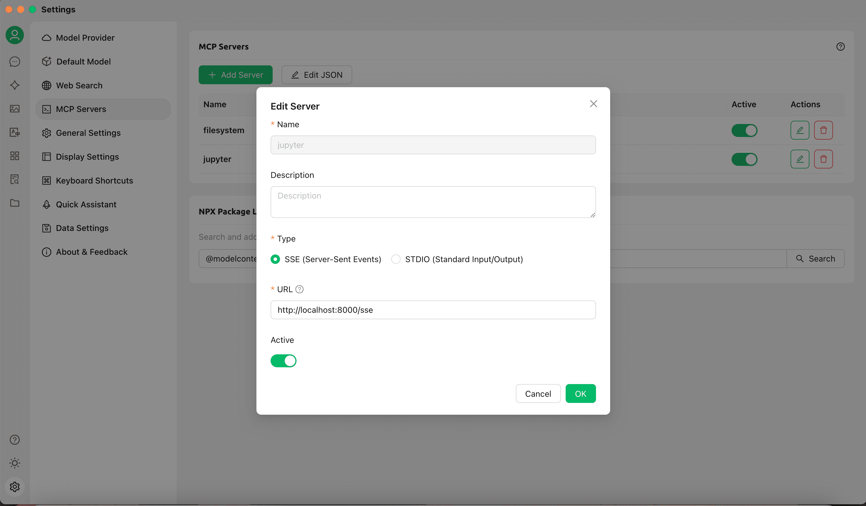 http://localhost:8000/sse, so next we need to config the MCP client to connect to the MCP server. The screenshot below shows the config with Cherry Studio.