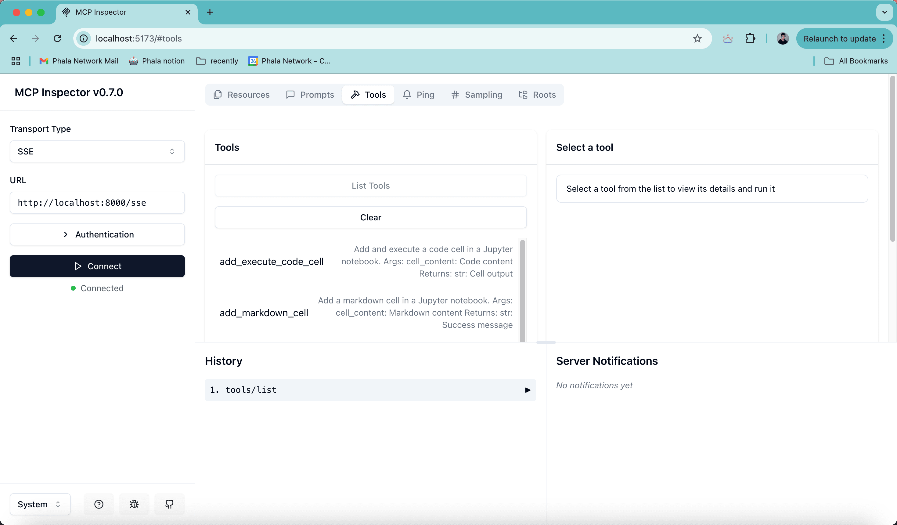 phalain the docker compose file. - In a new terminal, run the MCP inspector. The MCP inspector is an interactive MCP client that allows you to connect to Jupyter notebook MCP server and invoke tools from a web browser.