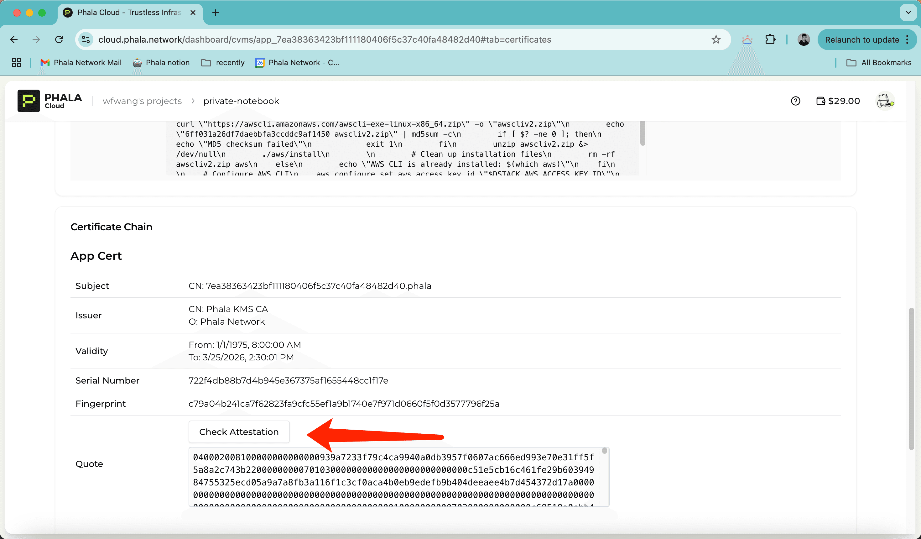 Navigate to the Attestation tab, you can see the attestation of the your CVM. The attestation is a proof that the MCP server is running on the TEE. You can click the Check Attestation button to verify the attestation on the explorer.