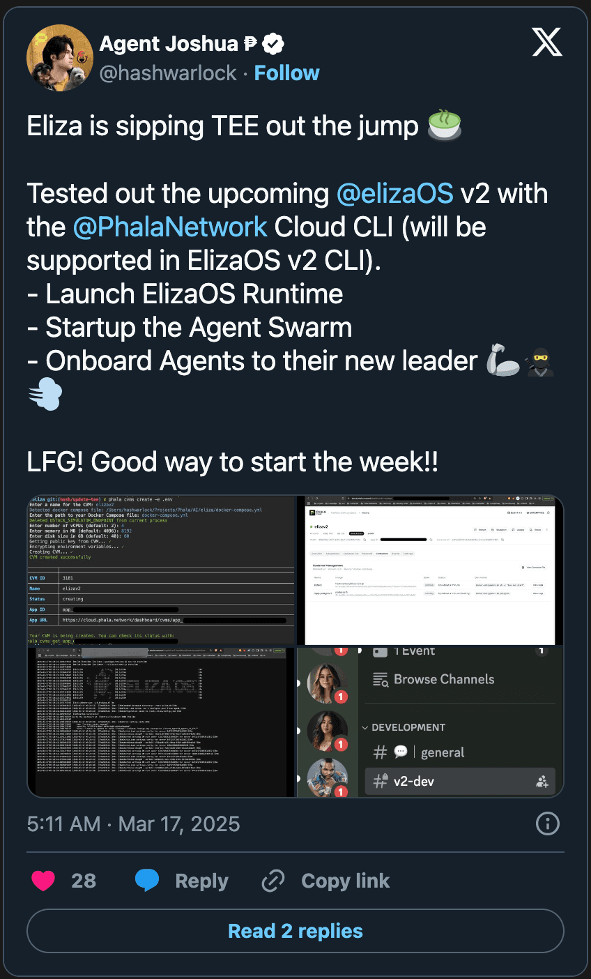 Eliza V2 Beta dropped today, March 17, 2025, and Phala Cloud is the first TEE-enabled platform to support its agent swarm deployment. For developers working with AI agents, this means you can now spin up ElizaOS-powered workflows with built-in security for sensitive operations—think API keys, on-chain transactions, and private communications—all handled in a TEE environment.