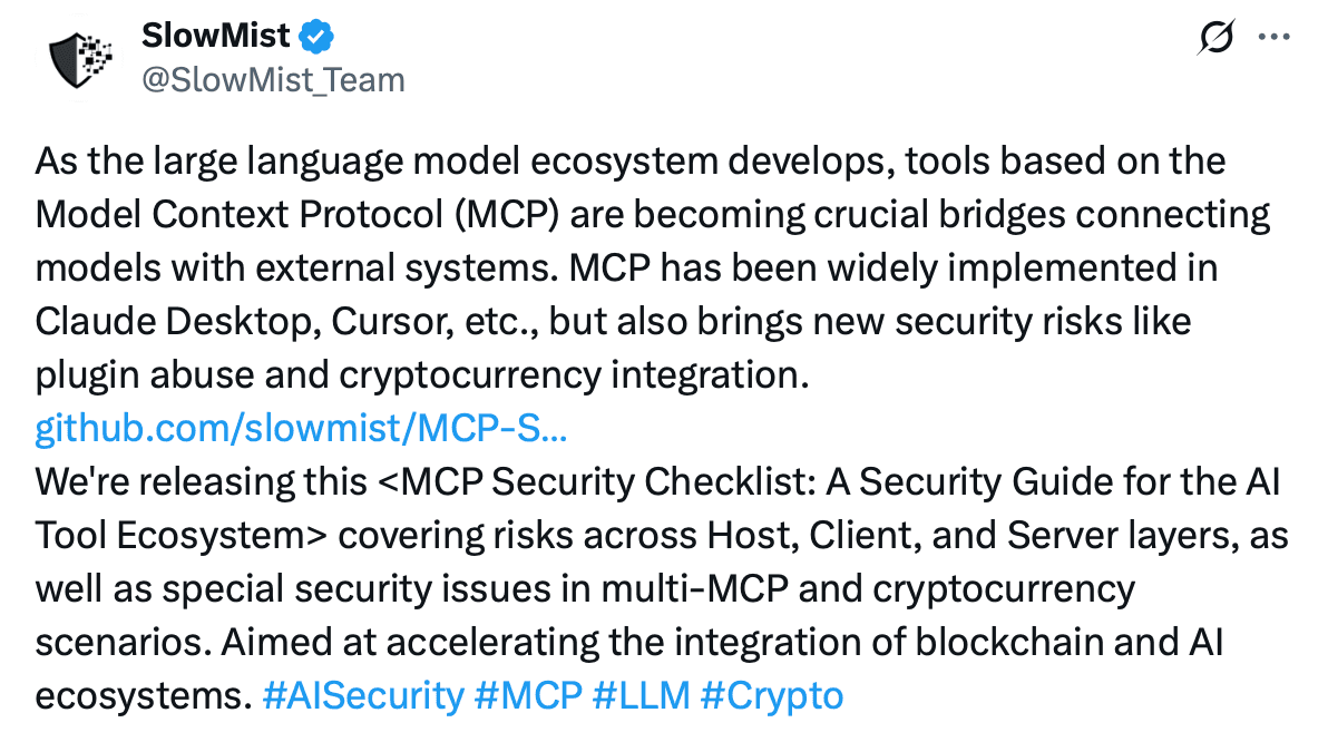 MCP is a game-changer for wiring AI to tools like databases or APIs. At its core, MCP is a protocol designed to bridge the gap between AI models and the external world. But it’s not without baggage; it also adds attack surface because of the connection of external resources and tools. A recent report from SlowMist, a security company from China, addressed the security issues that exist in the current design of the MCP protocol