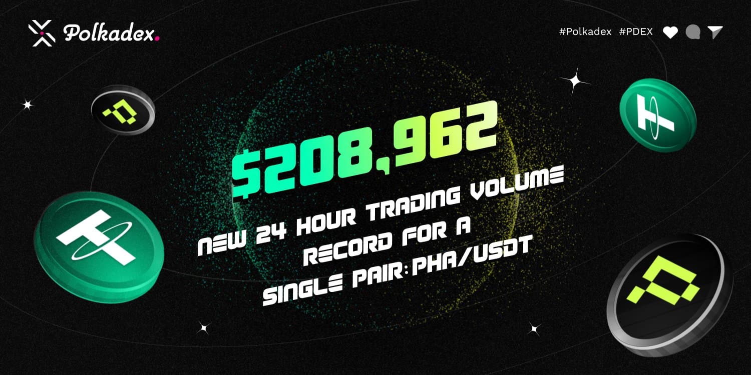 Polkadex announced Phala Network's PHA/USDT pair on the Polkadex Orderbook surpassed the 100k, 150k, and 200k milestones, reaching over $200,000 in 24-hour trading volume - a first for any pair on Orderbook.