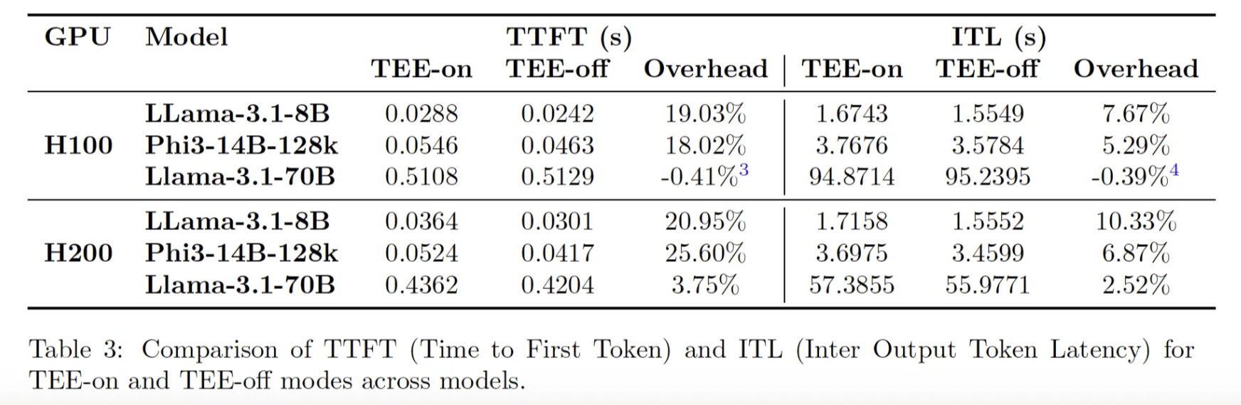 Real-time metrics such as Time to First Token (TTFT) and Inter-Token Latency (ITL) were used to evaluate latency. Both GPUs experienced minor latency increases in TEE mode, with the H200 displaying slightly higher overheads. However, as model size and sequence length grew, these latency effects diminished. The Llama-3.1-70B model, for instance, saw a TTFT overhead of -0.41% on the H100 and 3.75% on the H200. This indicates that TEE mode remains suitable for real-time applications, especially for larger, computation-intensive models where latency becomes less of a limiting factor.