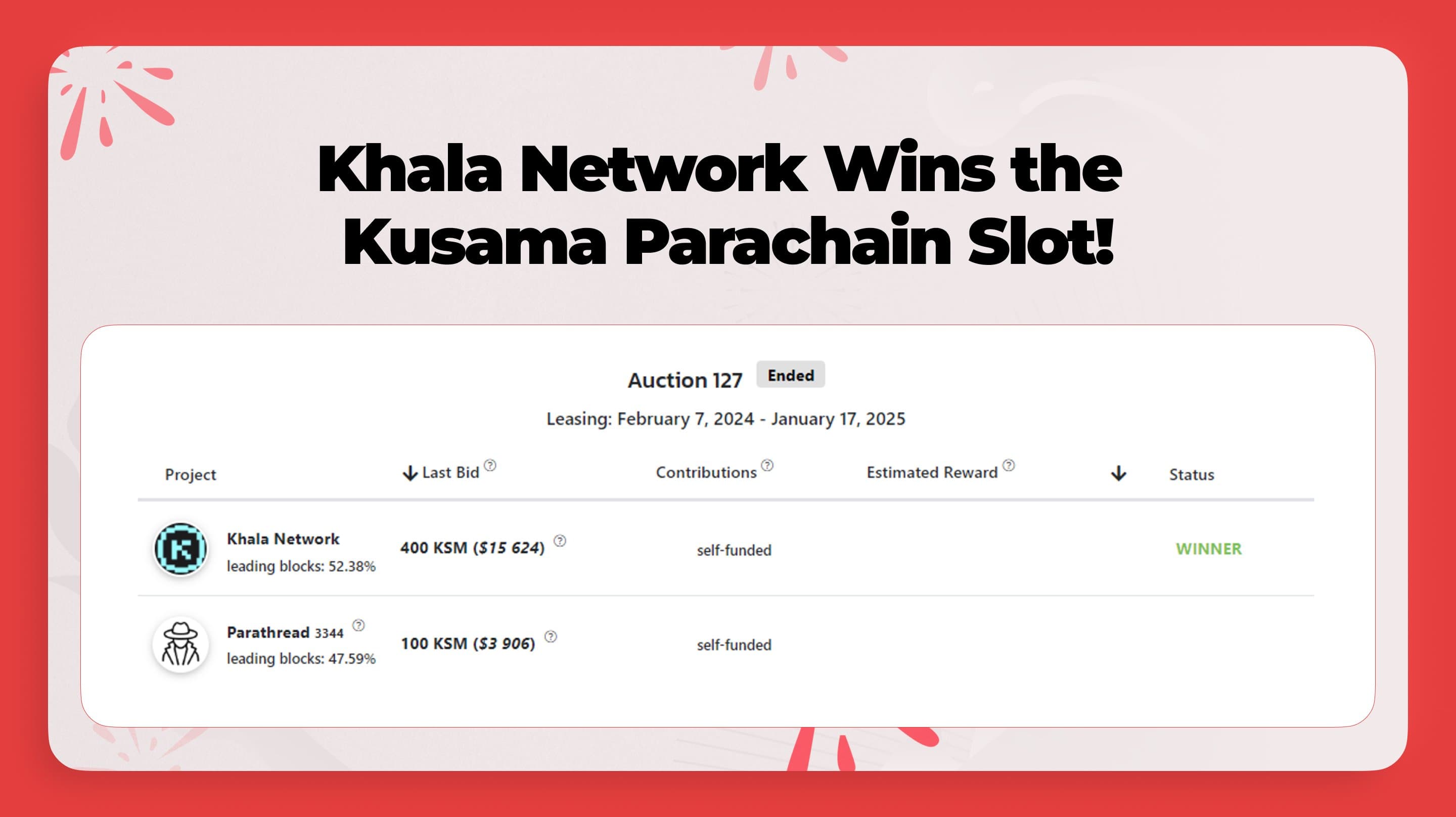 We celebrated a major win early this year by securing a parachain slot on Kusama network, marking a promising start for Khala, Phala Network's pre-mainnet. Our successful bid in auction number 127, with a final bid of 400 KSM and leading 52.41% of the blocks, set the stage for a year of advancements. The leasing period, from February 8, 2024, to January 17, 2025, underscores our commitment to growth on Kusama. Here's to celebrating this milestone and looking forward to future successes!