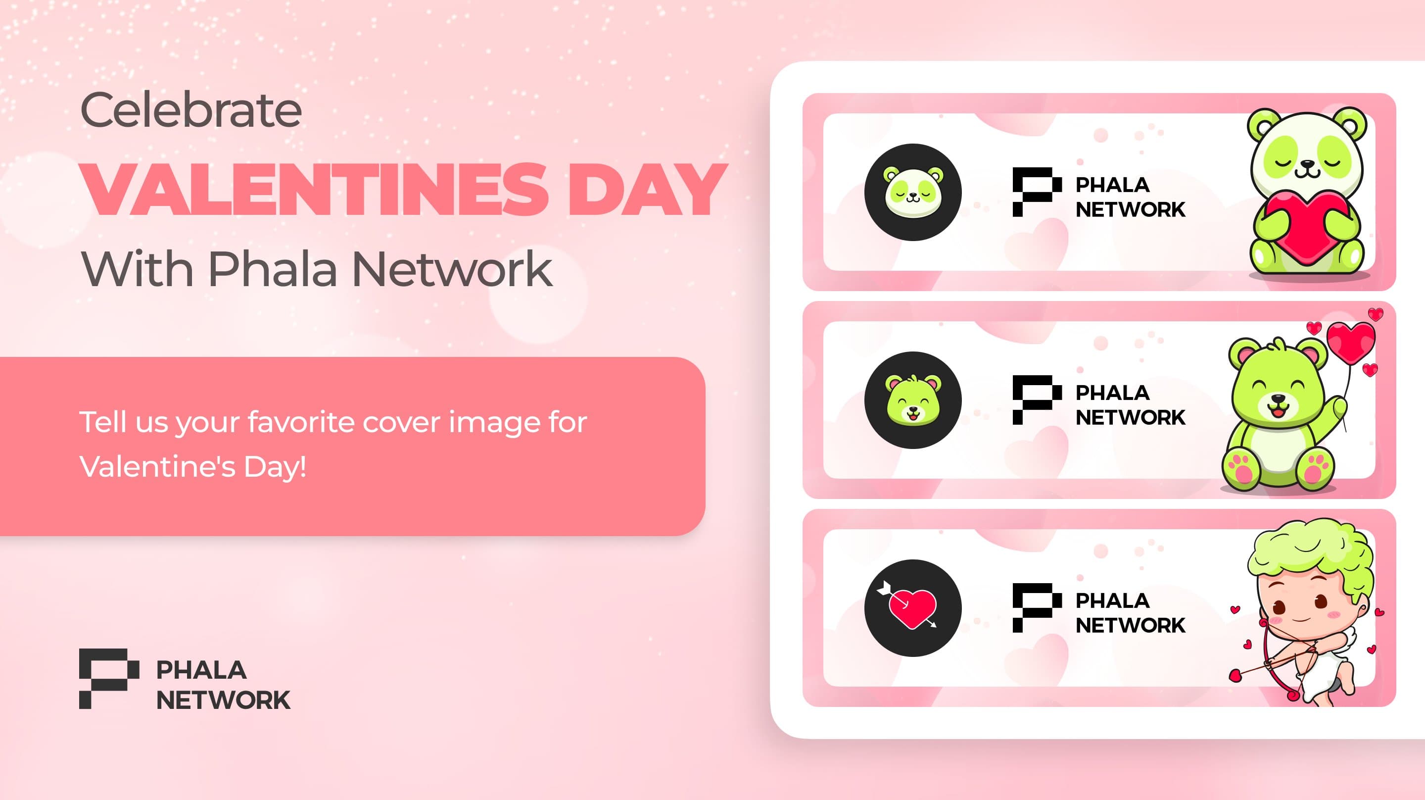 This Valentine's Day, Phala Network's community voted for a new profile cover, choosing the adorable Panda over Bear and Cupid. Thanks to everyone who participated and embraced the theme of love and pandas. A special POAP was offered to celebrate the occasion. Happy Valentine's filled with love!