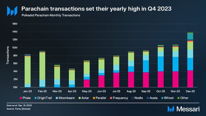 Messari's latest report highlights that Polkadot parachains averaged 12 million transactions monthly in Q4 2023. Thanks to incentives for computing power, staking, and Phat Contract usage, Phala Network contributed over 4 million transactions each month!