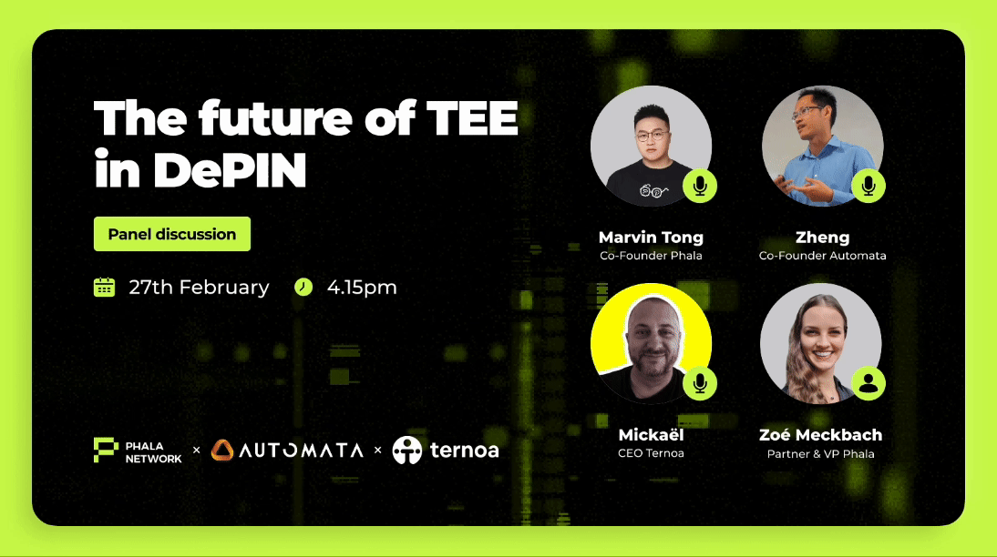 Phala will be hosting the panel at 2.30pm about ‘The rise of TEE in DePIN’, with our co-founder Marvin, speakers from Automata, Secret Network and moderated by Phala’s VP, Zoé.
