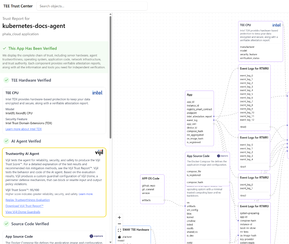 This example demonstrates why verifying agent behavior is as important as verifying the execution environment. A TEE cannot, by itself, prevent unsafe outputs; it provides the foundation to audit agents privately with cryptographic proof of execution. With Vijil agent evaluation and agent guardrails running within TEEs, developers can harden agents and verify improvements. The Phala Trust Center serves as both the interface to perform the process and the place where results are displayed.
