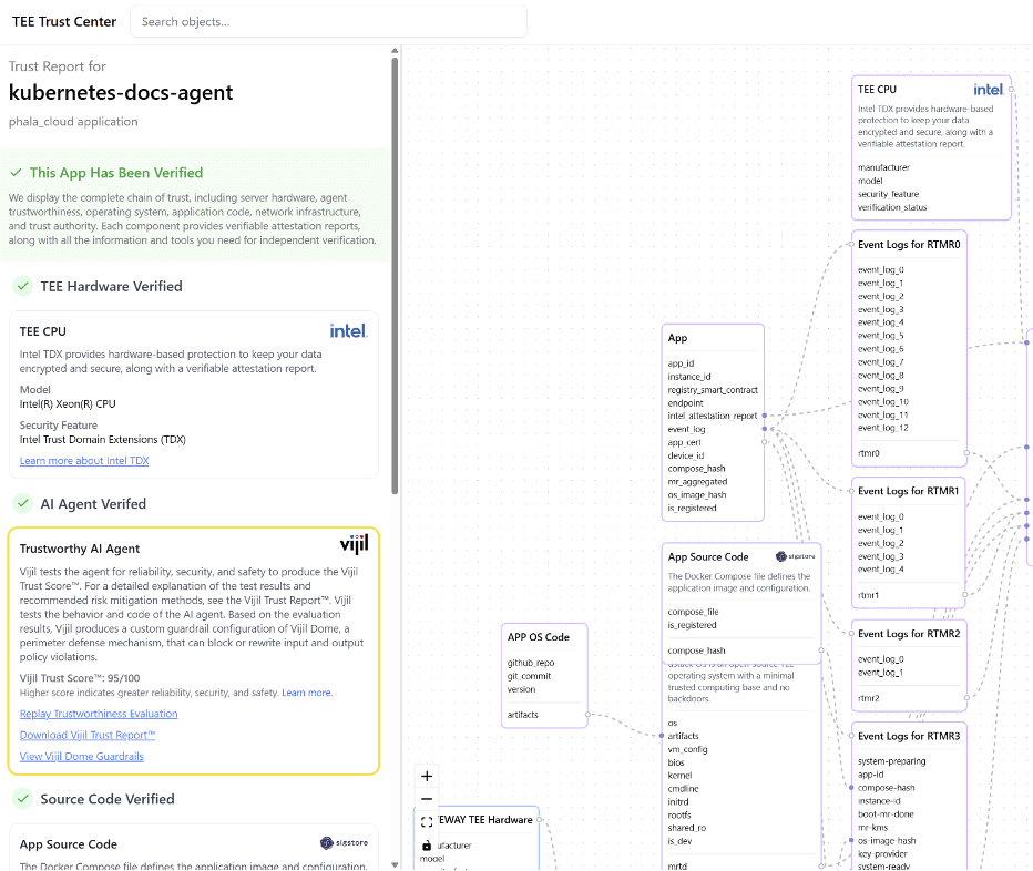 Traditionally, the Trust Center visualizes the attestation chain for a deployment — from hardware and OS to network gateways and key management. With Vijil, this chain extends to the agent itself. Developers can see environment-level and agent-level verification side by side, in one interface.