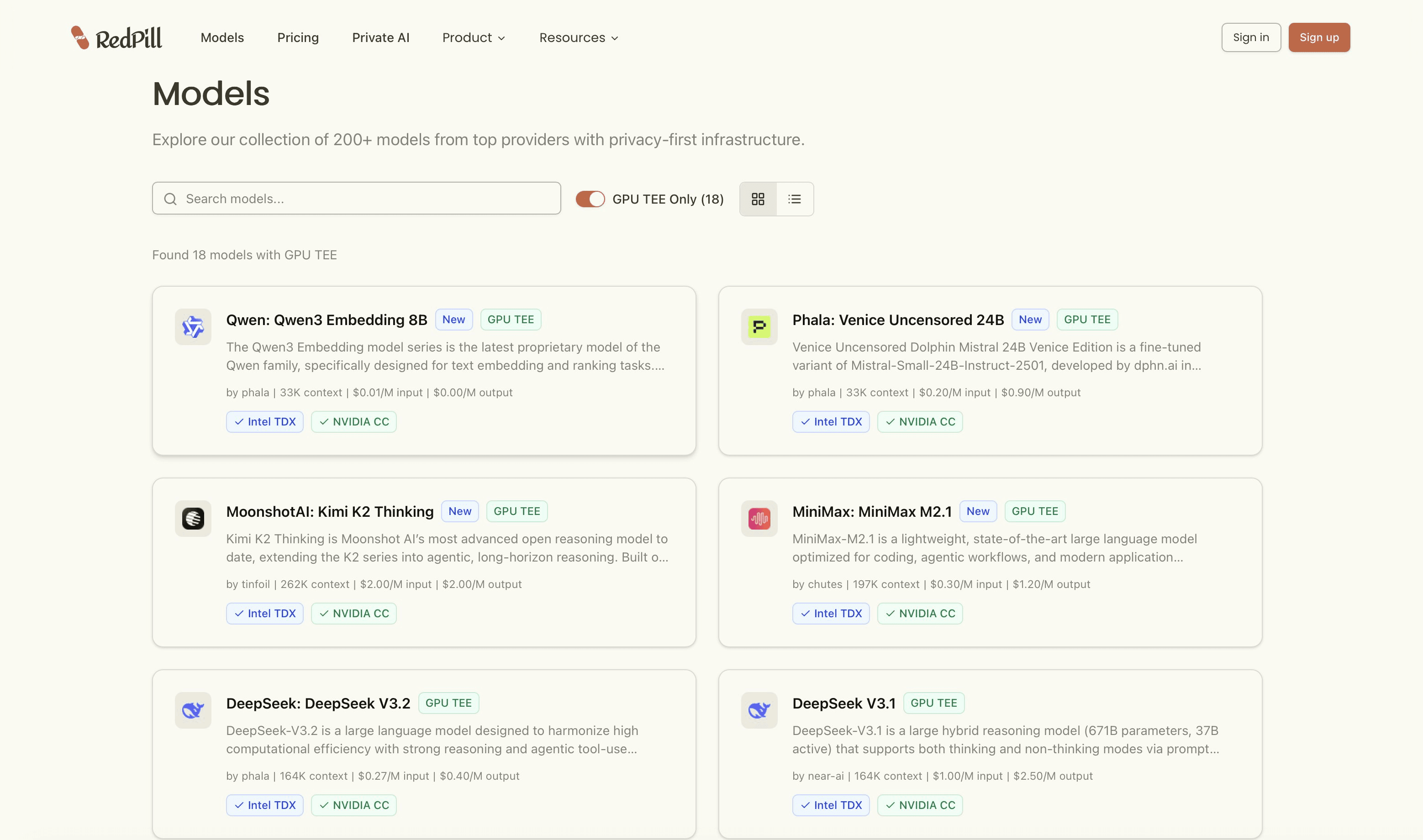 Unlike ChatGPT's one-size-fits-all approach, RedPill gives you access to over 60 specialized AI models. Choose DeepSeek V3 for reasoning and coding, Qwen for multilingual tasks and long-context analysis, Gemma for efficient and fast responses, or select from dozens of other models optimized for specific tasks.