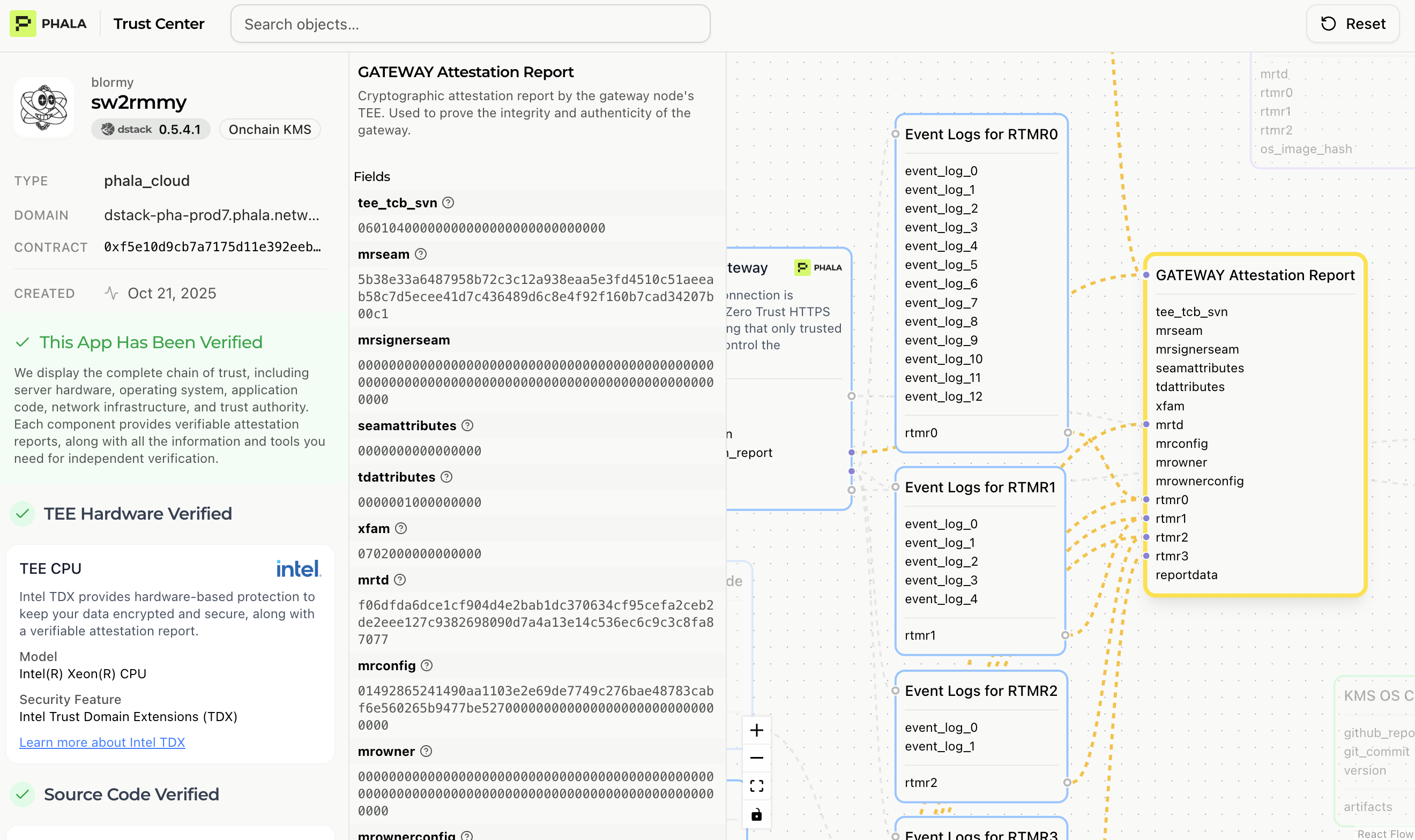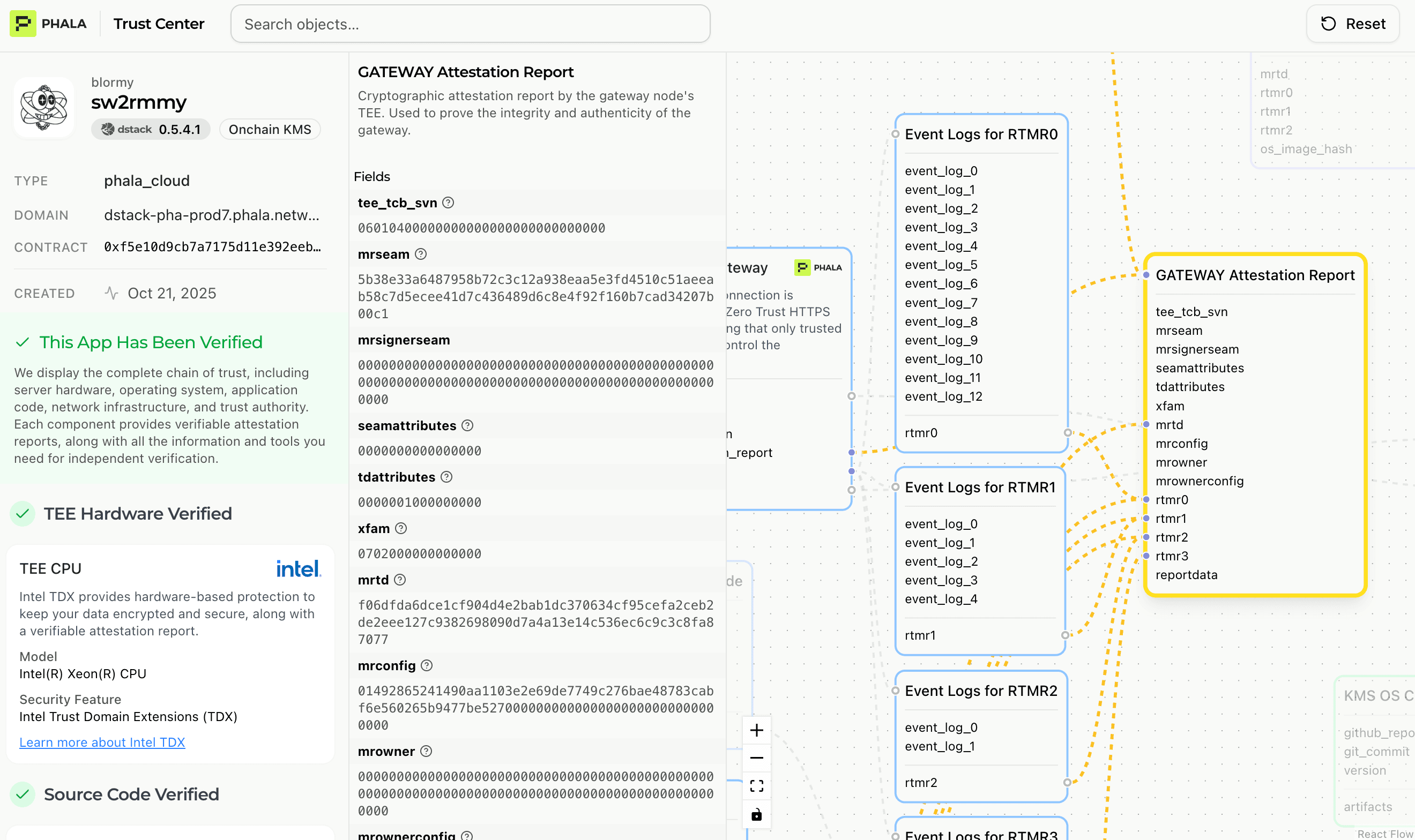 While hardware attestation reports come directly from Intel TDX and Nvidia Confidential Computing processors, only applications built on dstack — Phala's confidential deployment stack — generate the comprehensive evidence needed for Trust Center verification. Dstack captures everything: from hardware boot measurements to application code hashes to encrypted key management, creating an unbroken chain of trust that the Trust Center can verify end-to-end.
