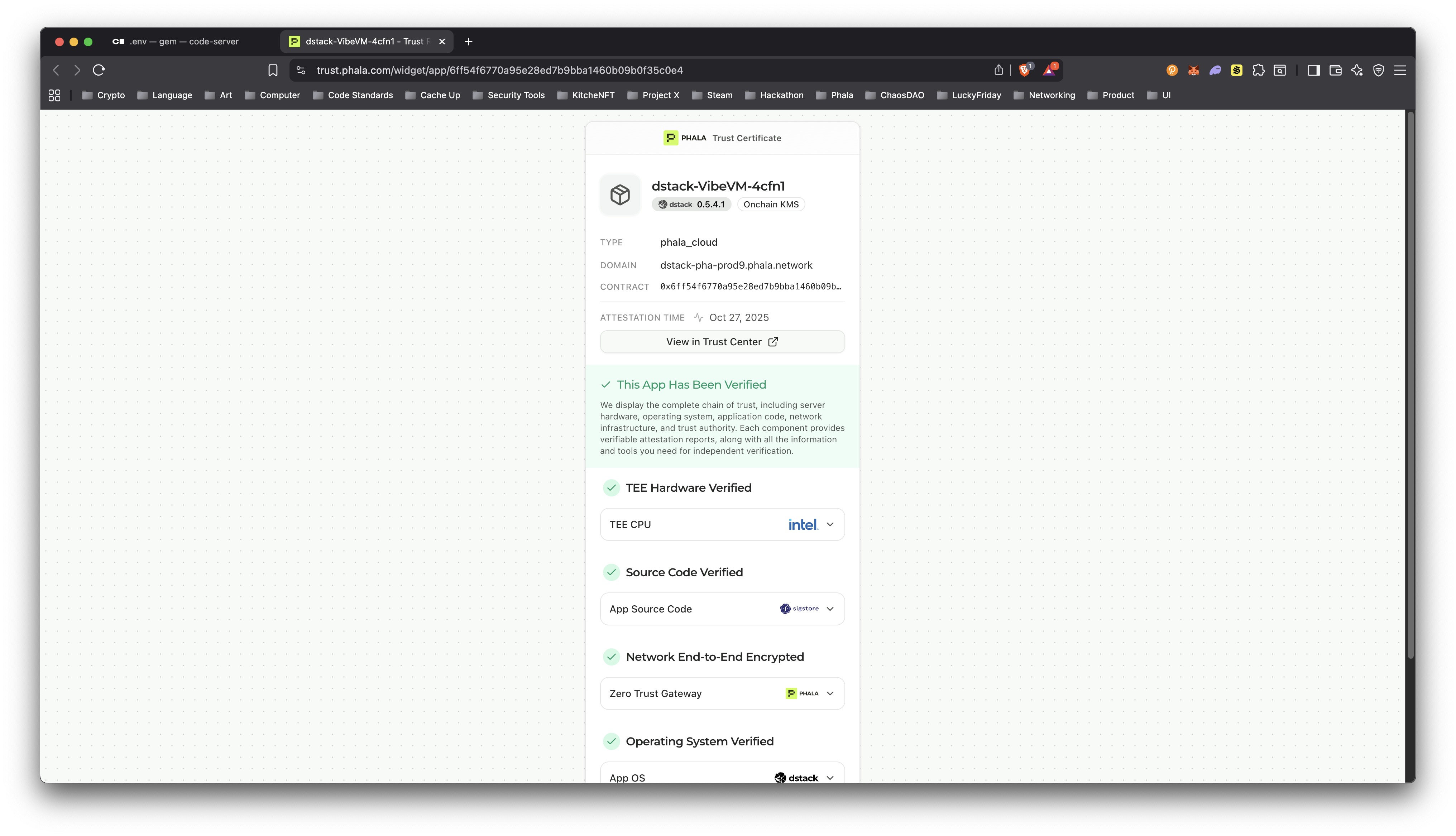 curl -sS http://<dstack-app-id>-8000.<dstack-gateway-domain>/api/trust-center-url # Ex. curl https://6ff54f6770a95e28ed7b9bba1460b09b0f35c0e4-8000.dstack-pha-prod9.phala.network/api/trust-center-url # {"trust_center_url":"https://trust.phala.com/widget/app/6ff54f6770a95e28ed7b9bba1460b09b0f35c0e4"}