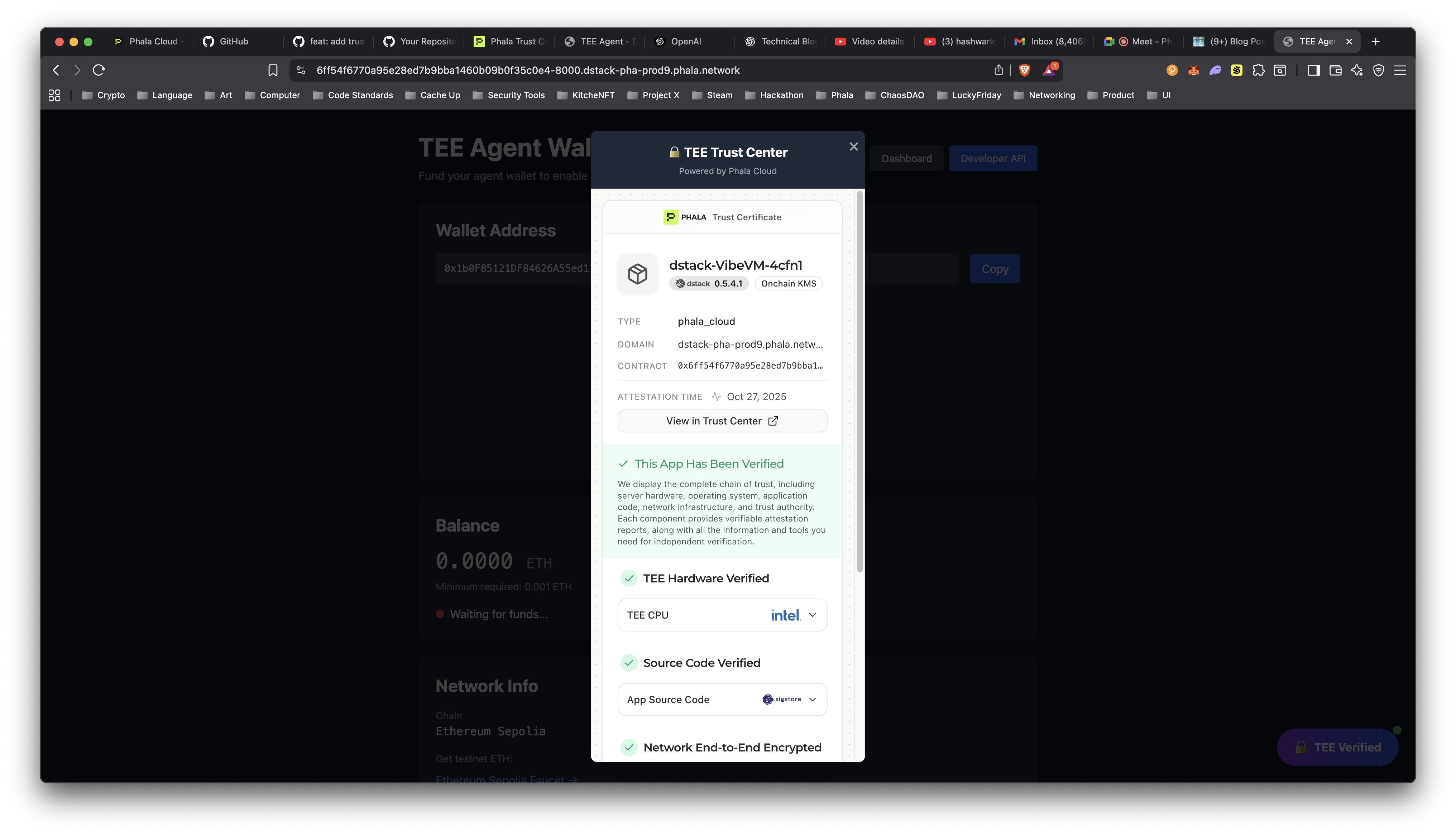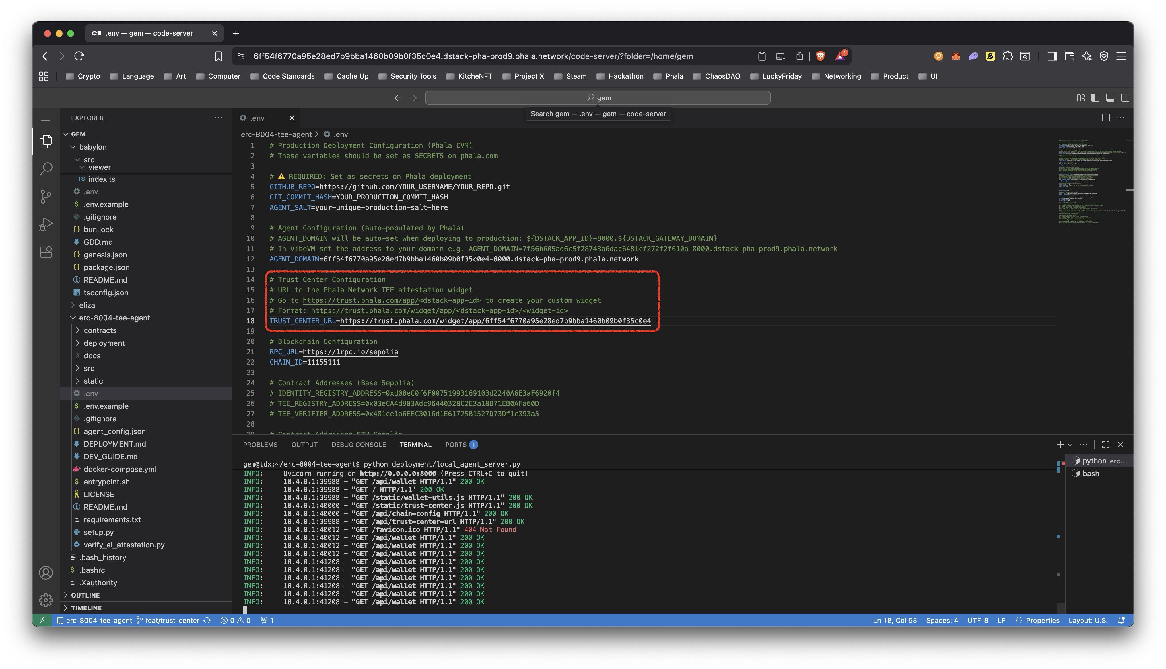 What this post is: a short, copy-paste technical walkthrough showing how PR #5 adds a Trust Center widget to the erc-8004-tee-agent UI, how to enable it in a VibeVM (env / docker-compose), and how to test the enabled vs disabled behavior. This guide uses the PR as an example implementation you can run in your Phala Cloud VibeVM.