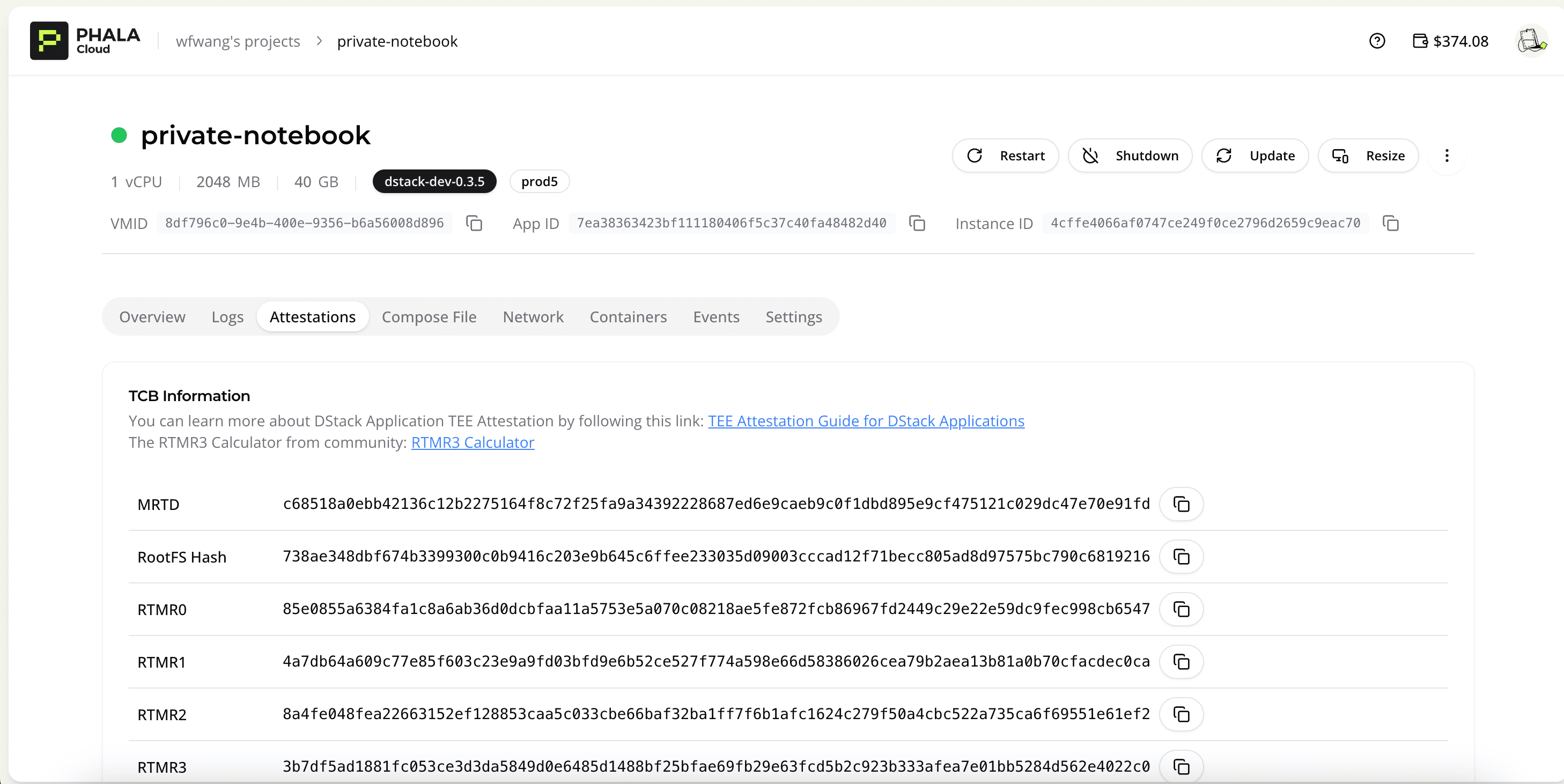 When you deployed your application on Phala Cloud, you can verify the RTMR3 with the data shown in dashboard attestation page. You can do it with a community tool called rtmr3-calculator.
