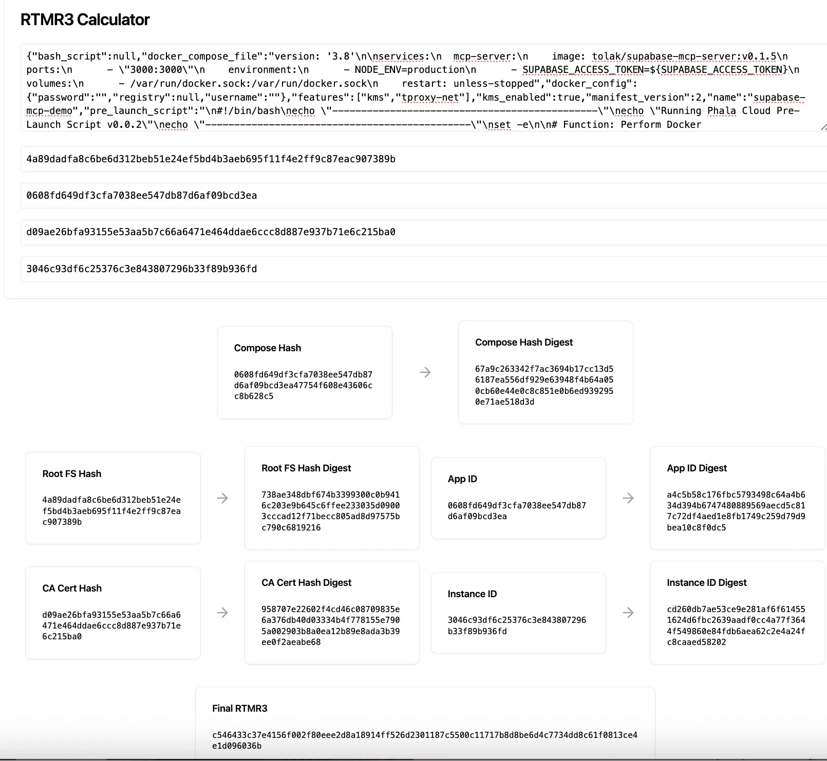 - Component Measurement: Each application component (compose-hash, instance-id, key-provider) is individually hashed.