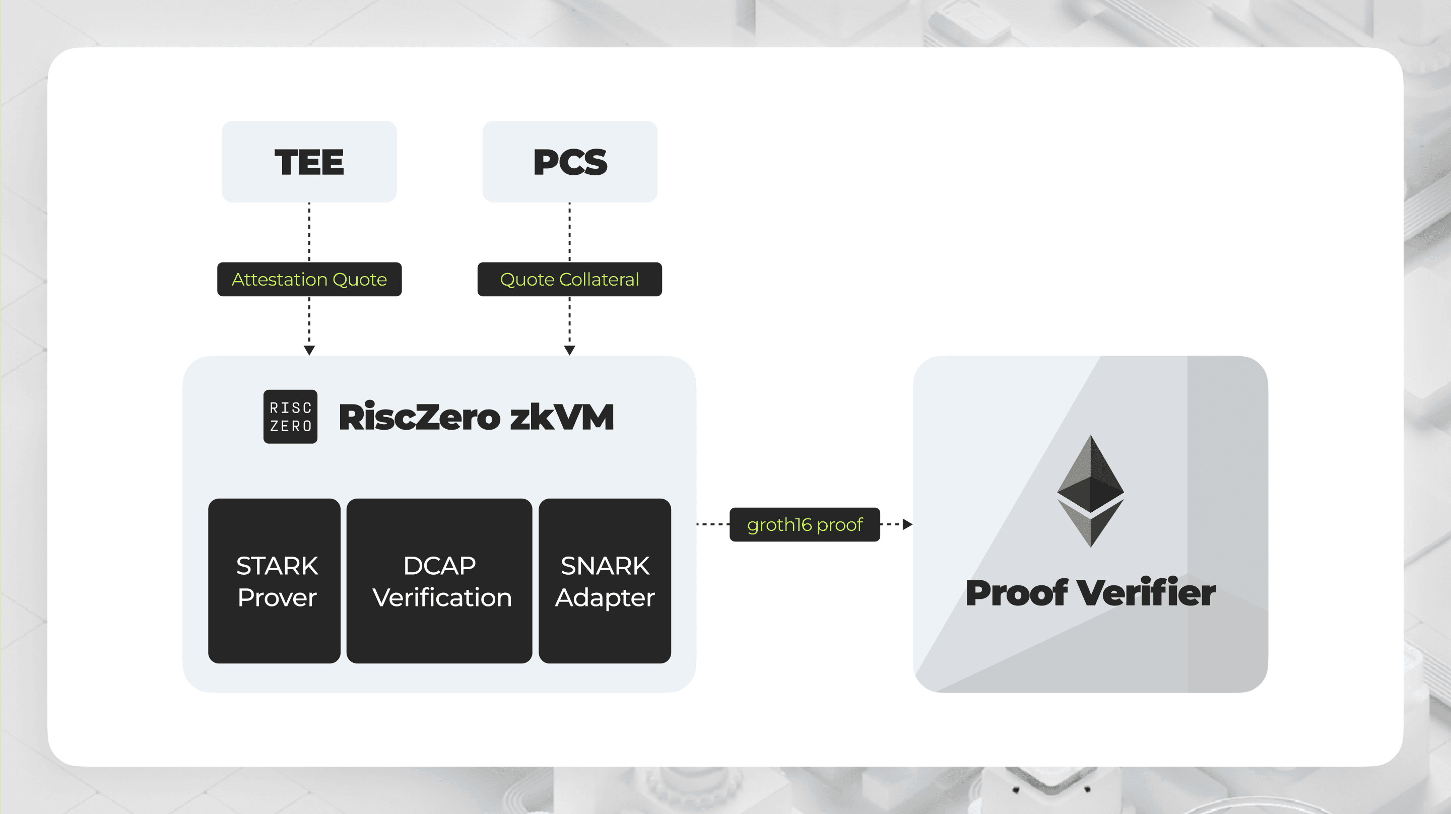 - By running the quote verification with DCAP in RiscZero zkVM, we ensure that the process is secure and efficient. The zkVM acts as part of the guest code, handling the complexities of verification.