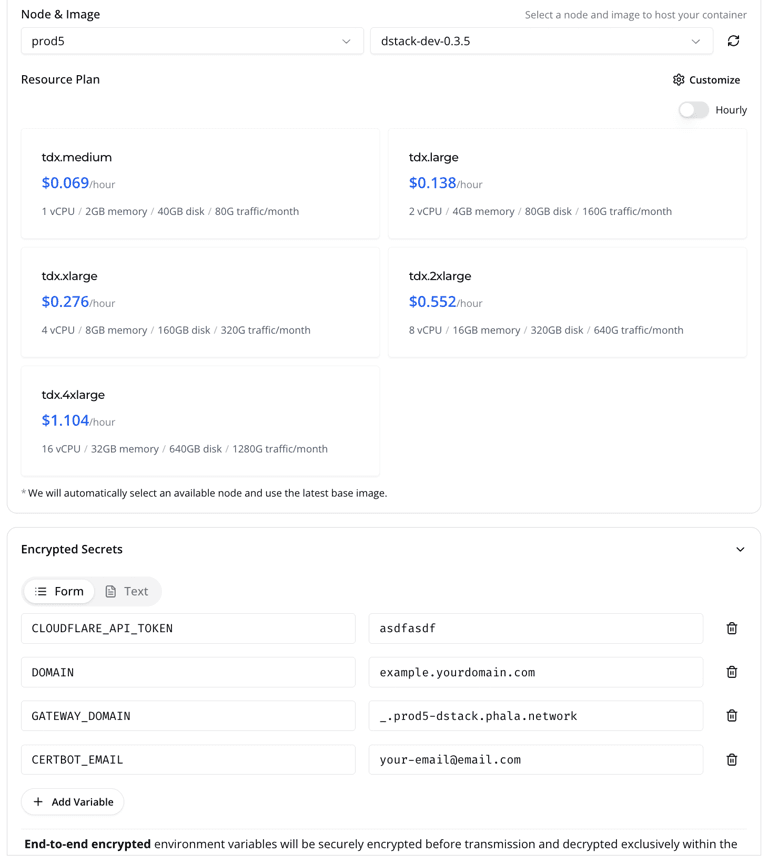 DOMAIN,CLOUDFLARE_API_TOKEN, etc.). Note that theGATEWAY_DOMAINshould in the format of_.prodX-dstack.phala.networkbased on which region you have chosen in the previous step.