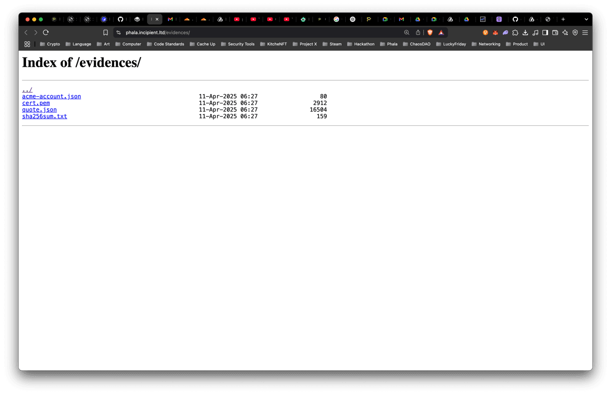 Because the quote is signed by Intel’s TDX Attestation Key and bound to the hash chain above, anyone can cryptographically prove the certificate was generated inside this very enclave. You can check the example of the deployment at phala.incipient.ltd/evidences/.